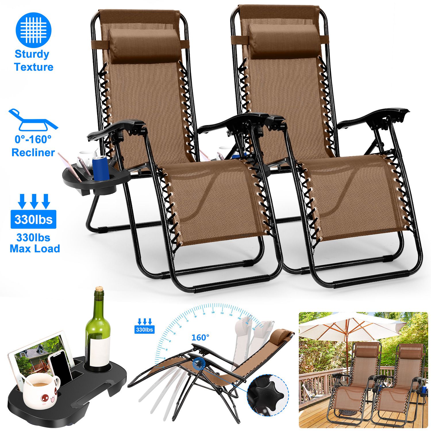 iMounTEK 2Packs Zero Gravity Lounge Chair Folding Recliner Chair with Cup Holder Tray 330lbs Load for Patio Garden, Brown
