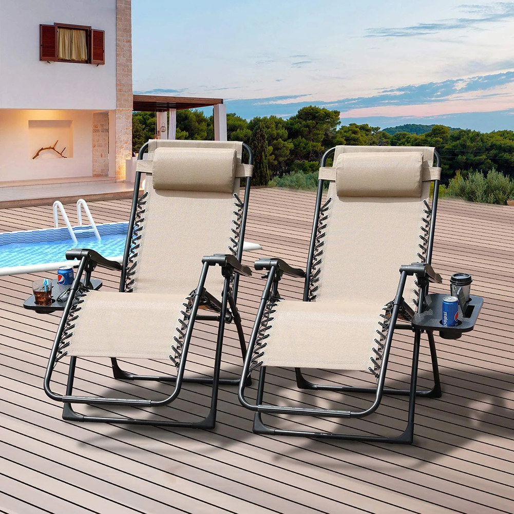 SuperDeal Set of 2 Zero Gravity Lounge Chairs Folding for Patio Beach w/Cup Holders Beige