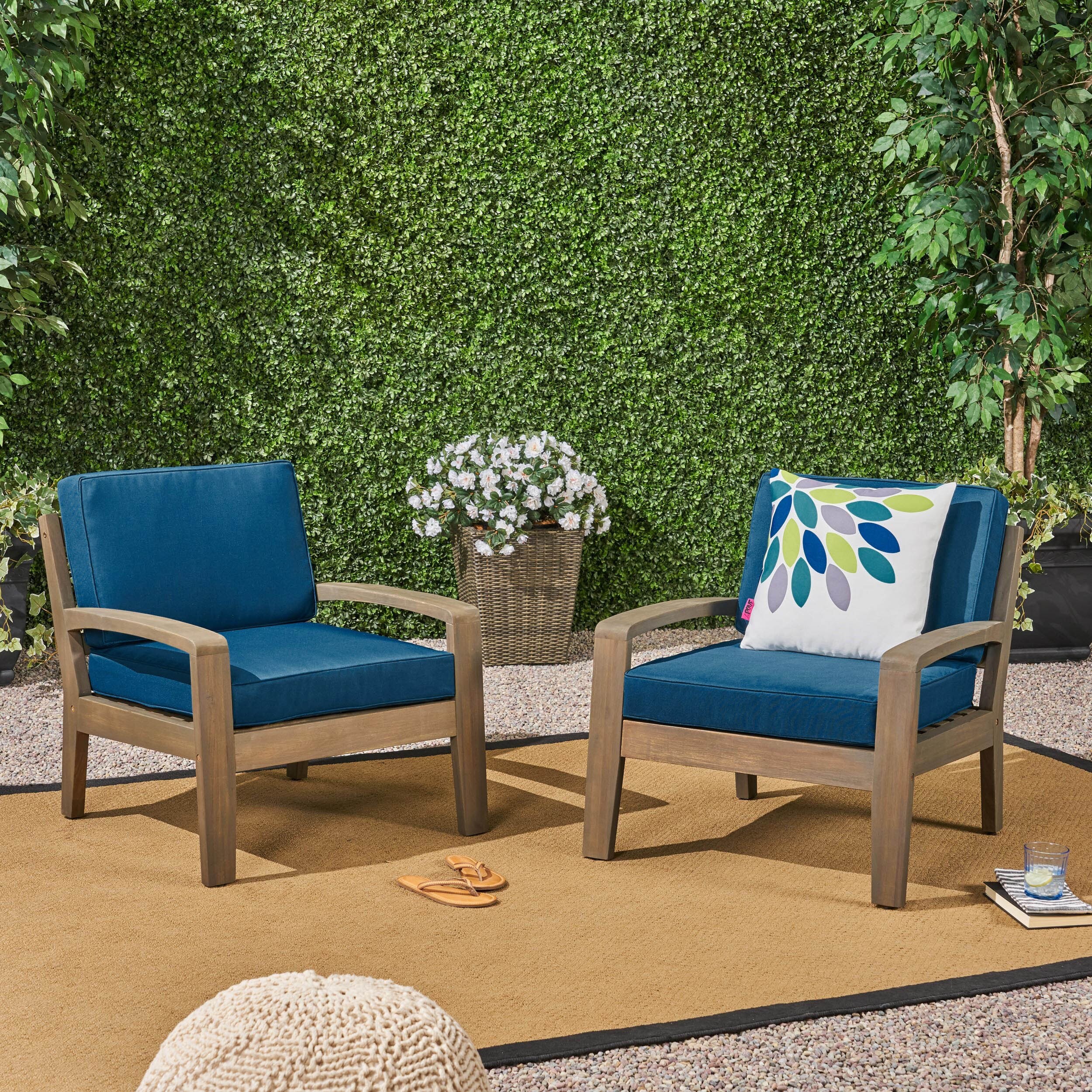 Christopher Knight Home Grenada Outdoor Acacia Wood Club Chairs with Cushions (Set of 2) by Grey Finish + Dark Teal Cushion