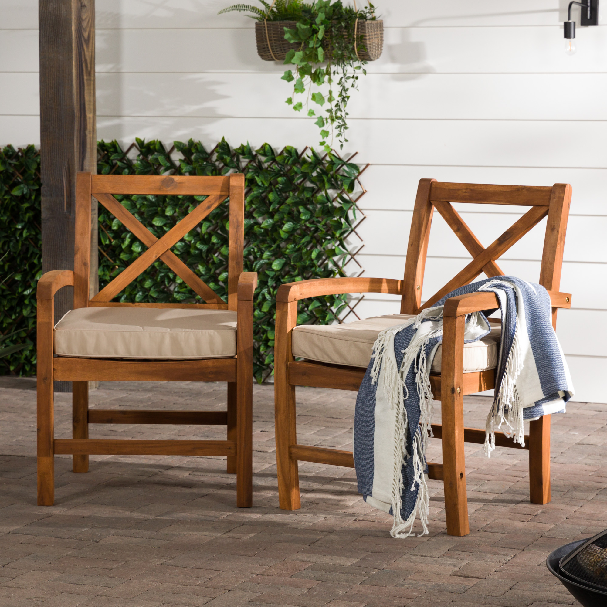Walker Edison Classic 2-Piece X-Back Solid Acacia Wood Patio Chairs with Cushions - Brown