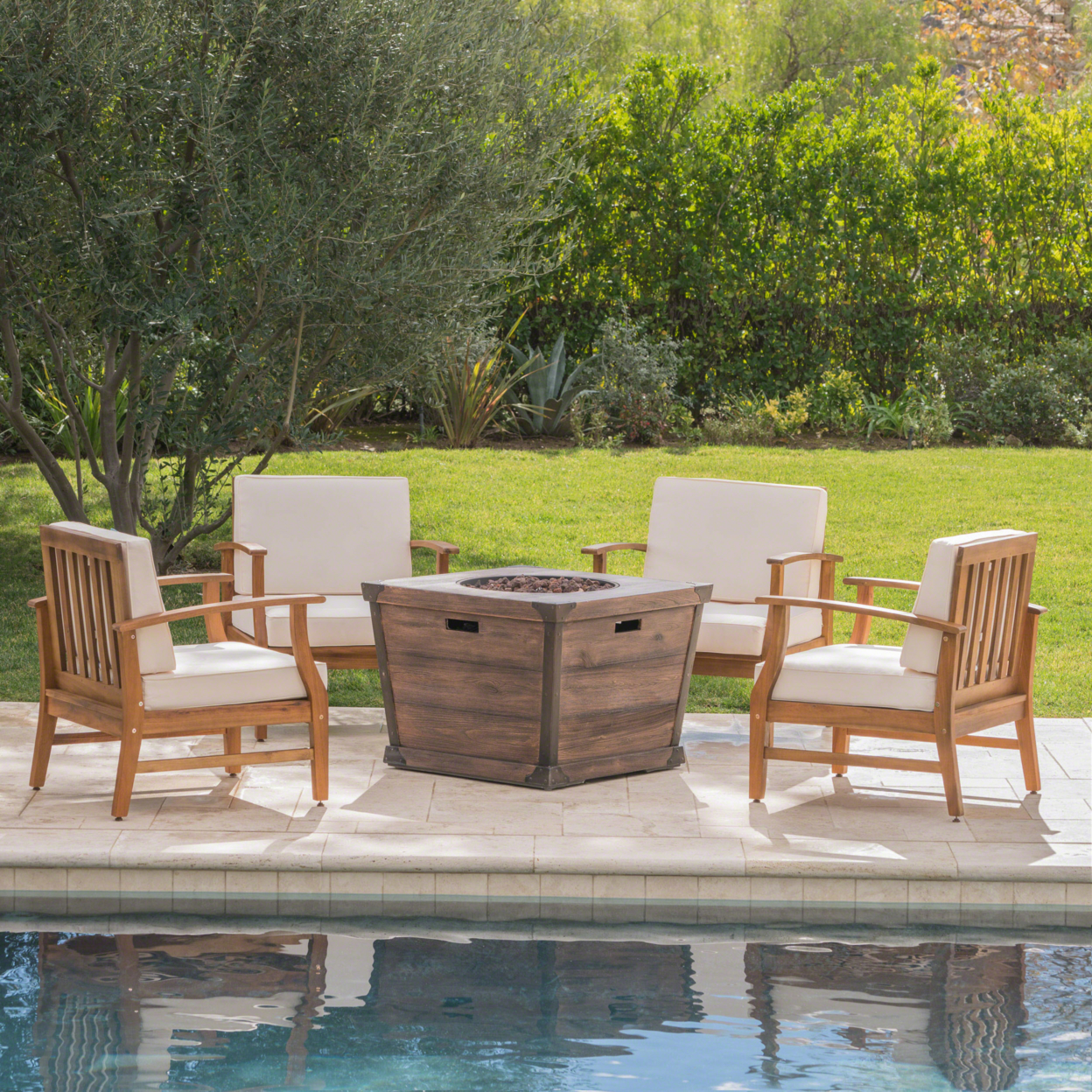 GDF Studio Belle Outdoor 4 Seater Acacia Wood Club Chairs, Teak, Cream, Brown