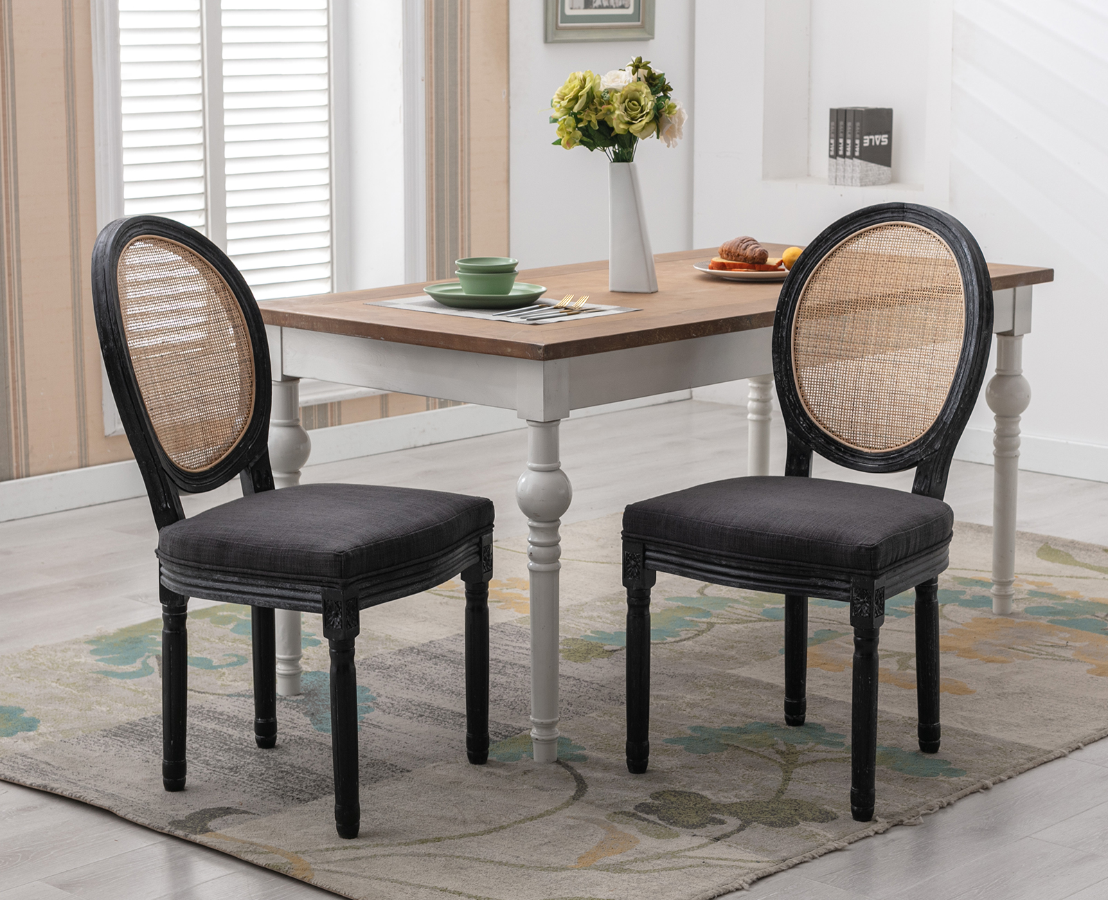 Guyou Farmhouse Dining Chairs Set of 2, French Retro Country Upholstered Linen Side Chair with Round Rattan Backrest and Wooden Legs for Dining Room Living Room Kitchen Bistro, Beige