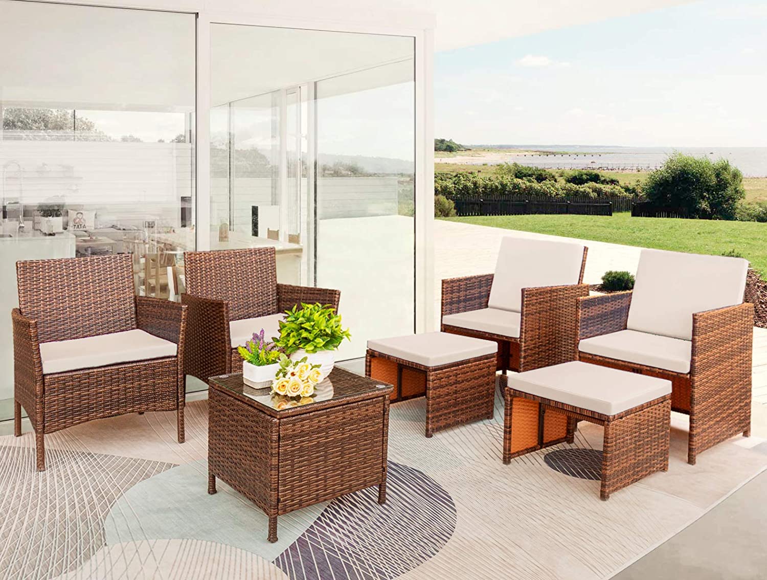 Vineego 7 Pieces Patio Furniture Set Outdoor All Weather Cushioned Wicker Chairs with Ottoman and Glass Table (Beige)