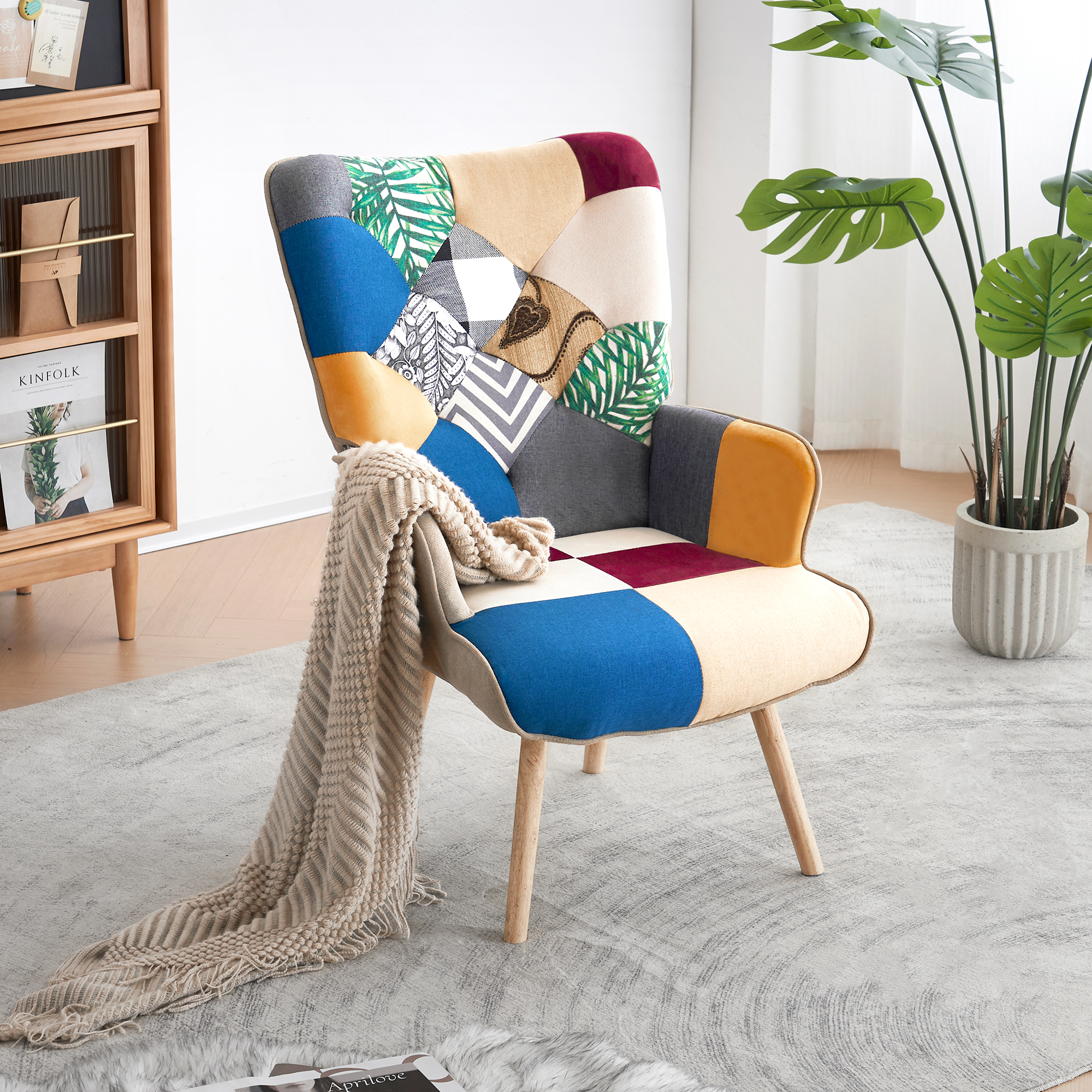 Bafode Living Room Accent Chair, Patchwork Lounge Chair - Wingback and Armrest with Breathable Linen Fabric Shell and Thick Foam Padded Solid Wood Feets, Boho Decor for Bedroom Colorful