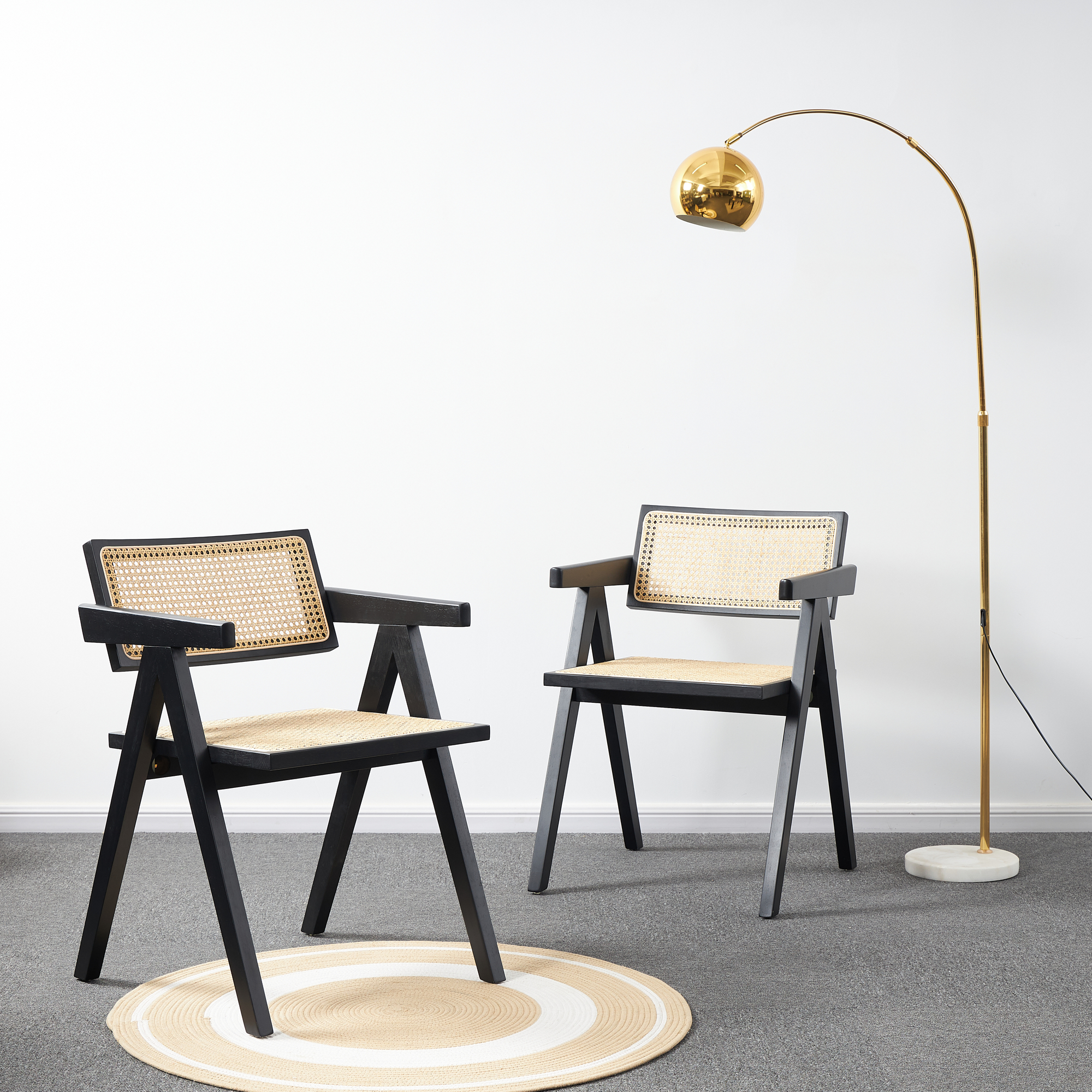 Set of 2 Black Rubber Wood Armchairs with Rattan Seat Black Wood Colour, Living Rooms, Outdoor, Wooden Rattan Chairs, Modern Furniture