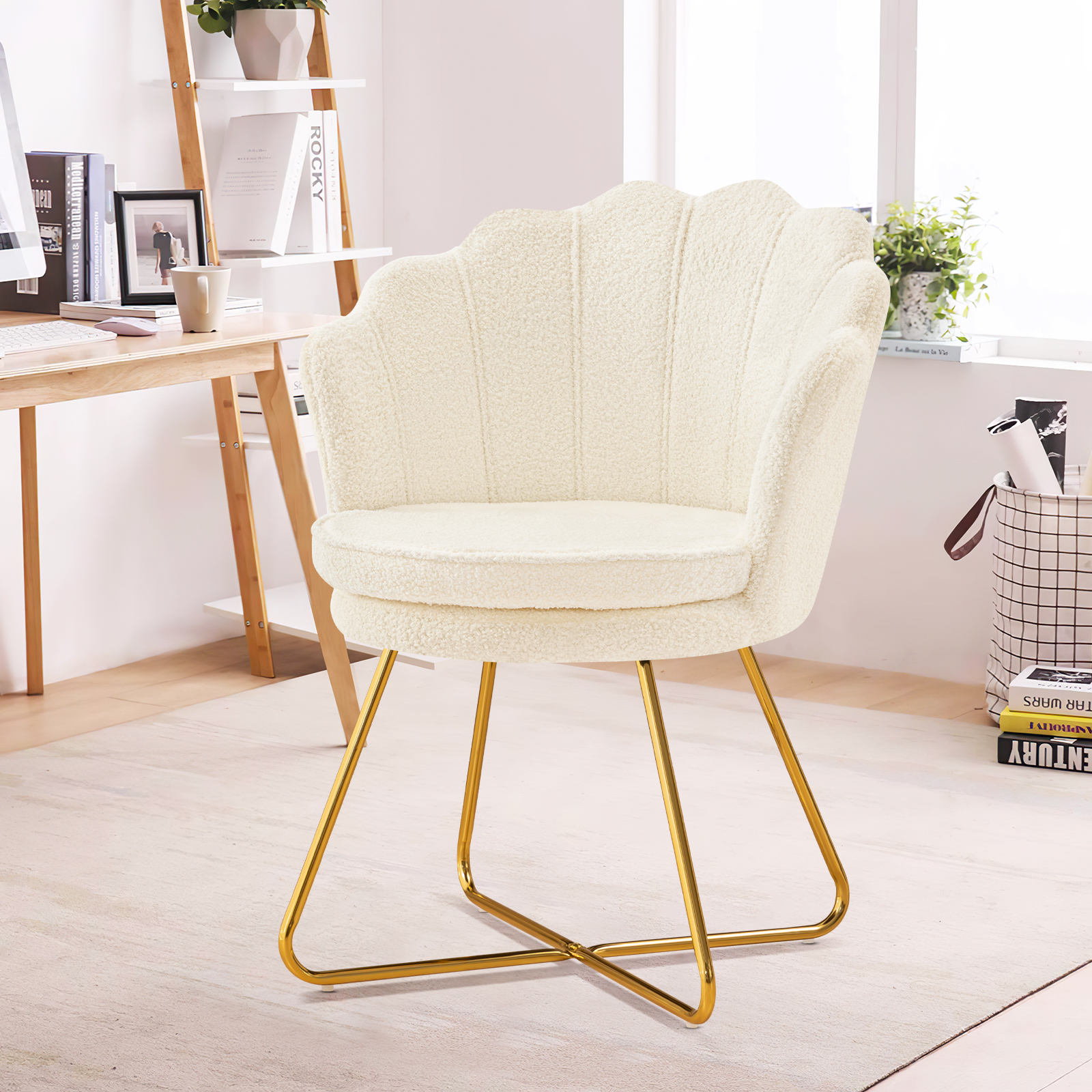 Furniliving Modern Sherpa Accent Chair Shell Back Makeup Chair Upholstered Arm Chair, White