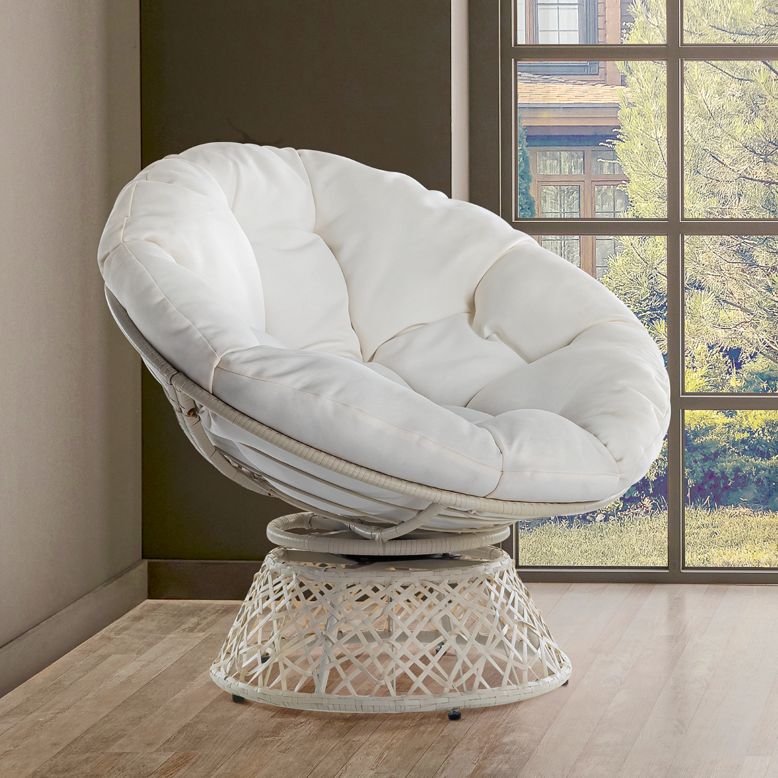 Aile 360 Swivel Comfy Papasan Chair with Fabric Cushion, Sturdy Metal Frame (Pure Pearl - White Frame)