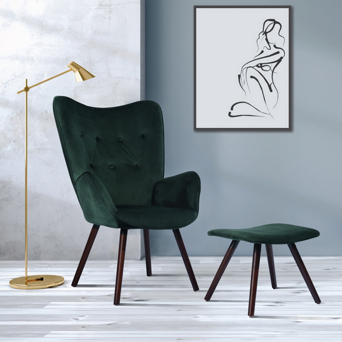 Homy Casa Accent Chair with Ottoman, Tufted Velvet Upholstery, Dark Green
