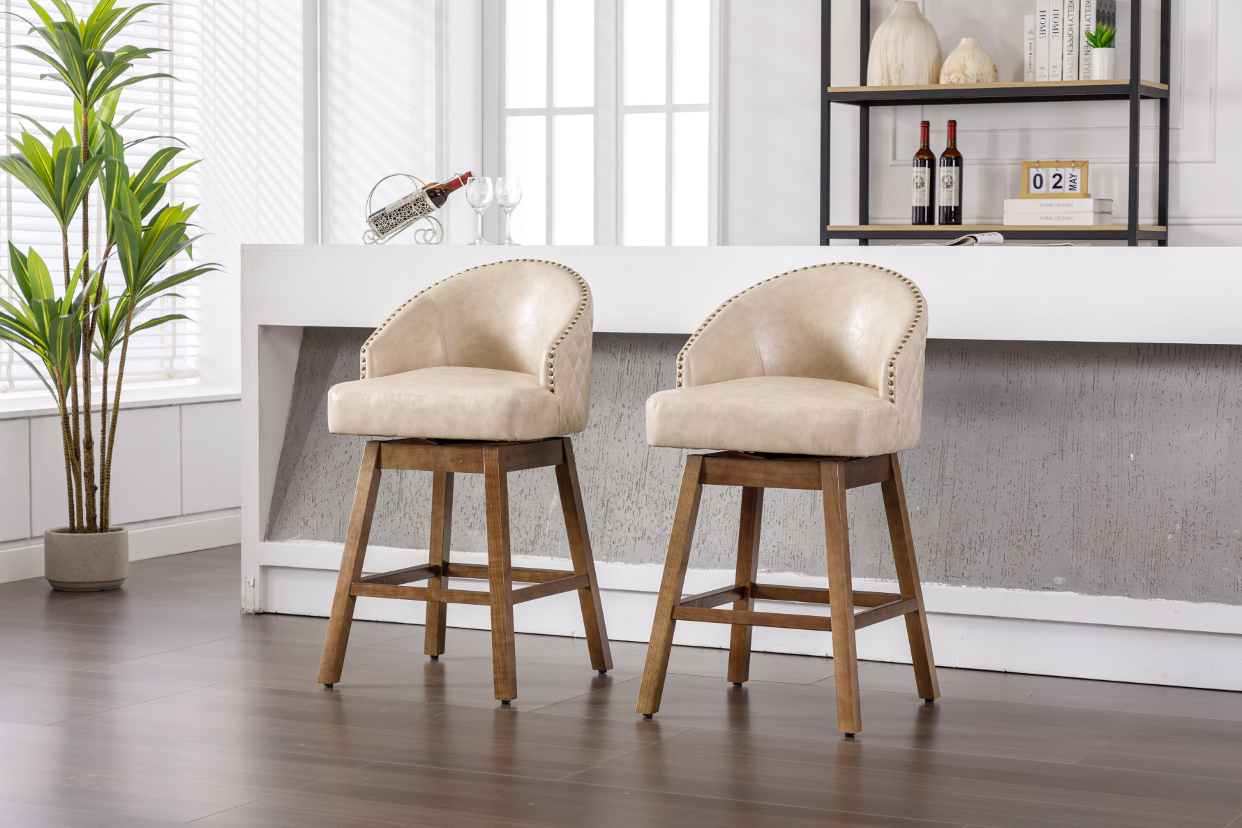 360 Degree Swivel Bar Stools Set of 2, Counter Height Bar Chairs with Back and Footrest, PU Counter Height Bar Stools with Arm for Kitchen Dining Room, Apricot