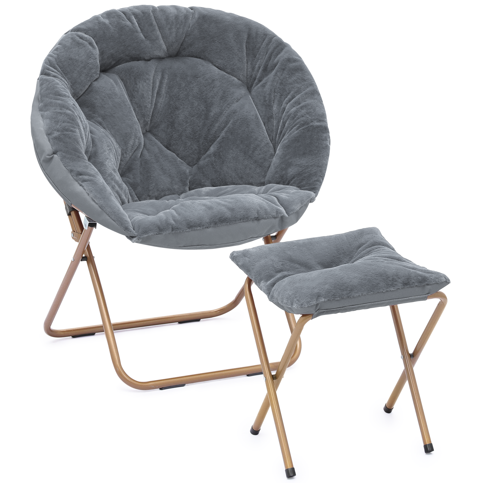 Magshion Folding Saucer Chair and Footrest Stool Set, Soft Faux Fur Oversized Accent Chair, Metal Frame Moon Chair for Bedroom Living Room, Gray