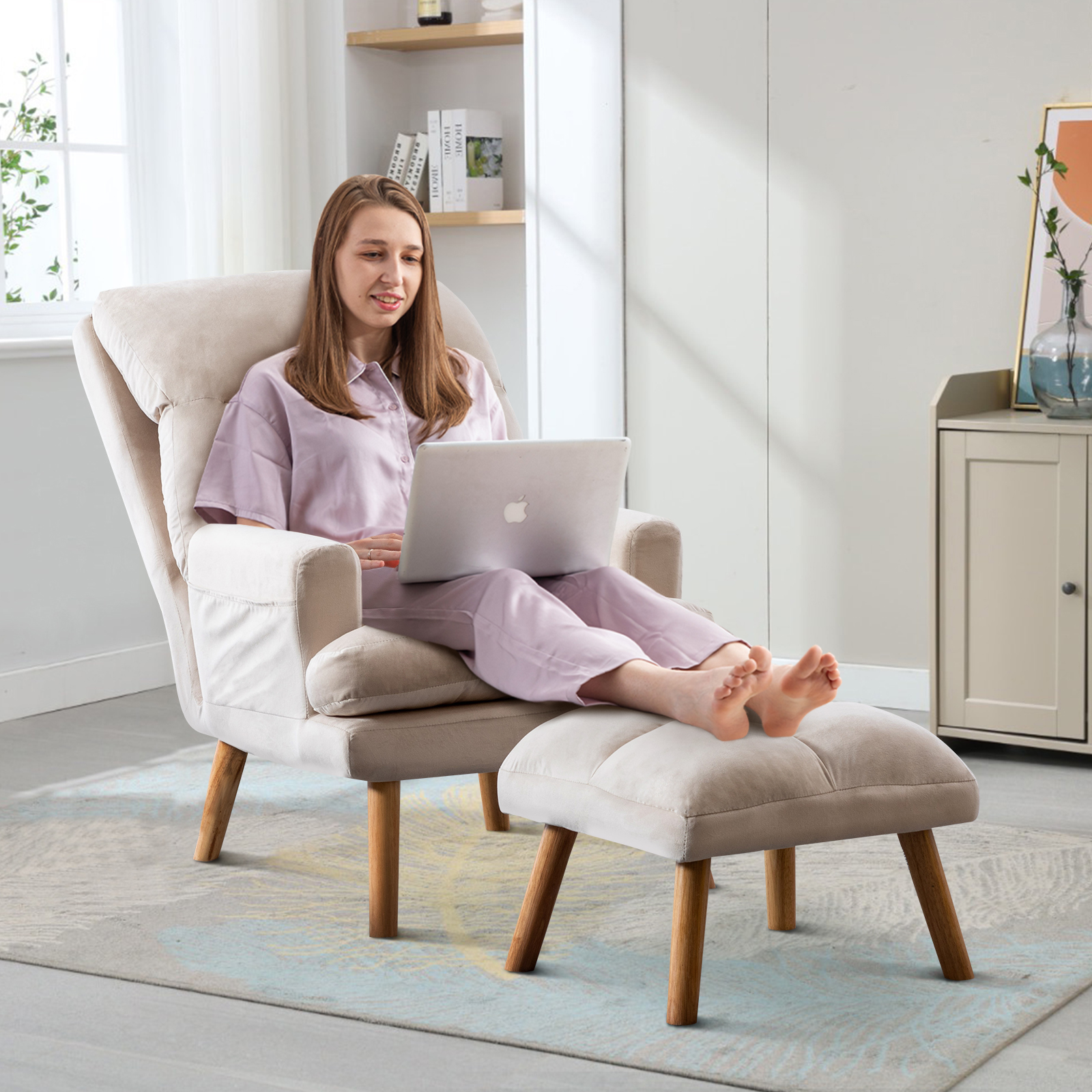 Ebello Accent Chair with Ottoman, Adjustable Backrest Seat,Velvet Fabric Chair for All Age,Beige
