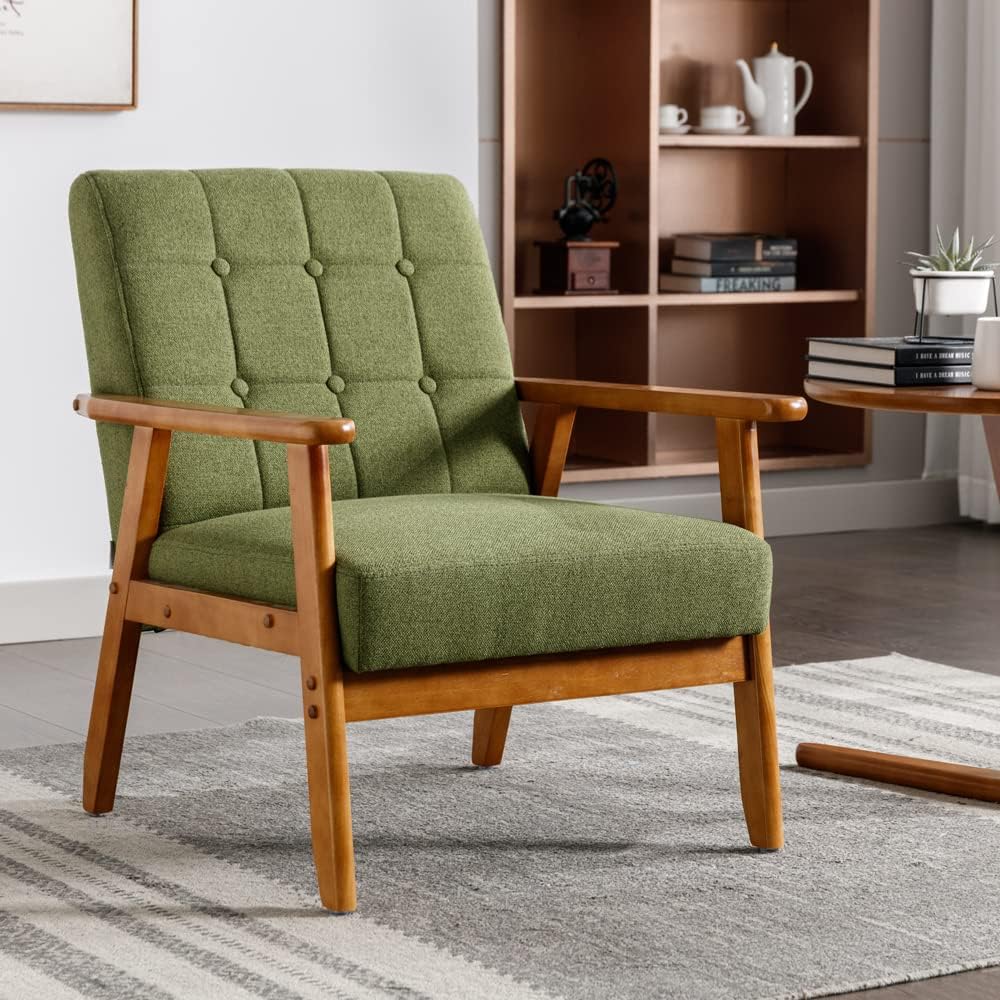 Holaki Mid Century Modern Arm Chair with Wood Frame,Linen Fabric Comfy Reading Chair,Accent Chair for Living Room Bedroom Reading,Easy Assembly,Green Linen