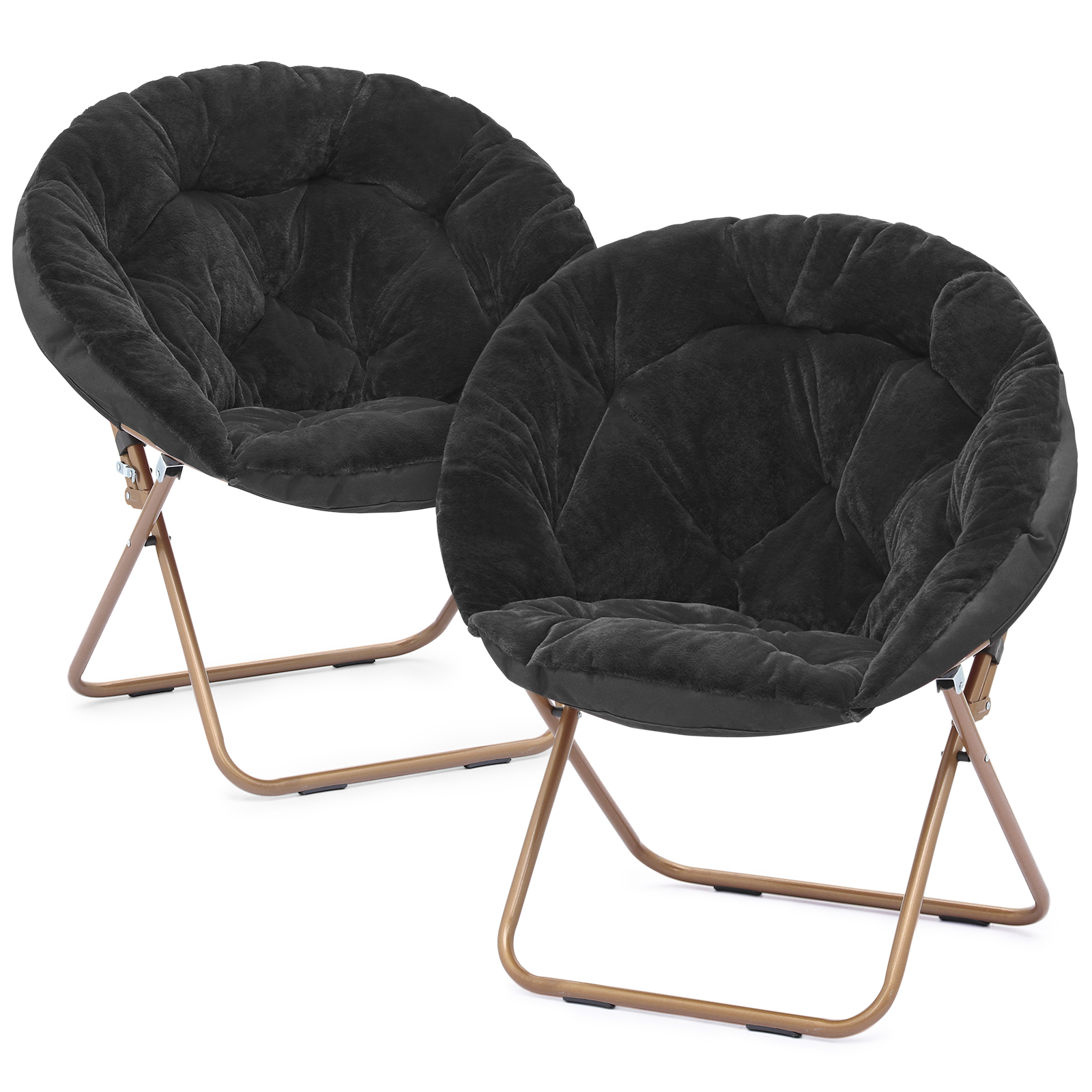 Magshion Set of 2 Saucer Chair Soft Faux Fur Folding Accent Chair, Lounge Lazy Chair Moon Chair Seat with Metal Frame for Bedroom Living Room, Black
