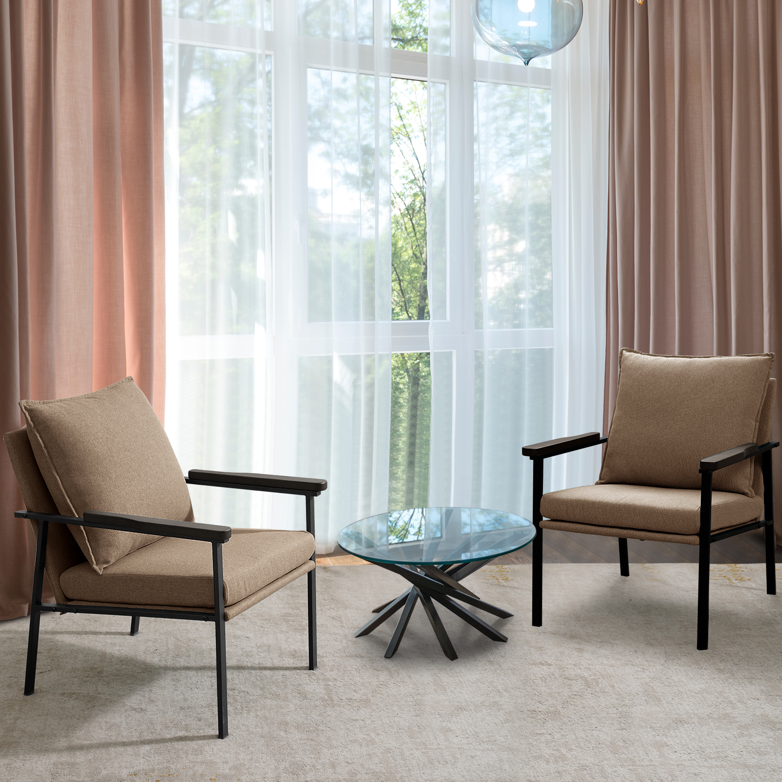 Fairyland Linen Fabric Modern Accent Chair with Metal Frame, Upholstered Club Chair, Clearance Arm Chair for Small Space and Office, Brown(Set of 2)