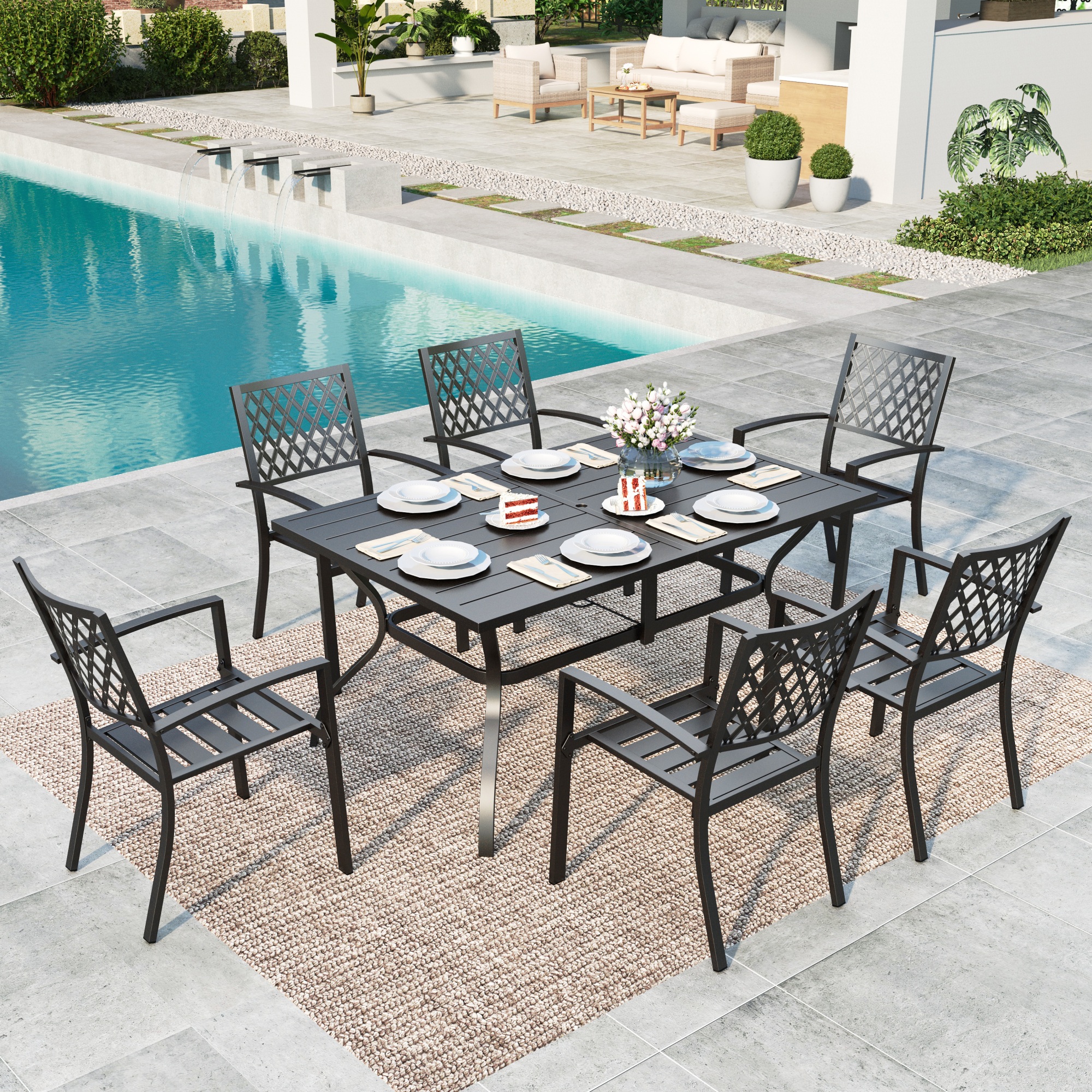 MF Studio 7-Piece Outdoor Patio Dining Set Modern Steel Furniture with 6 Slatted Armchairs and 1 Rectangular Table, Black