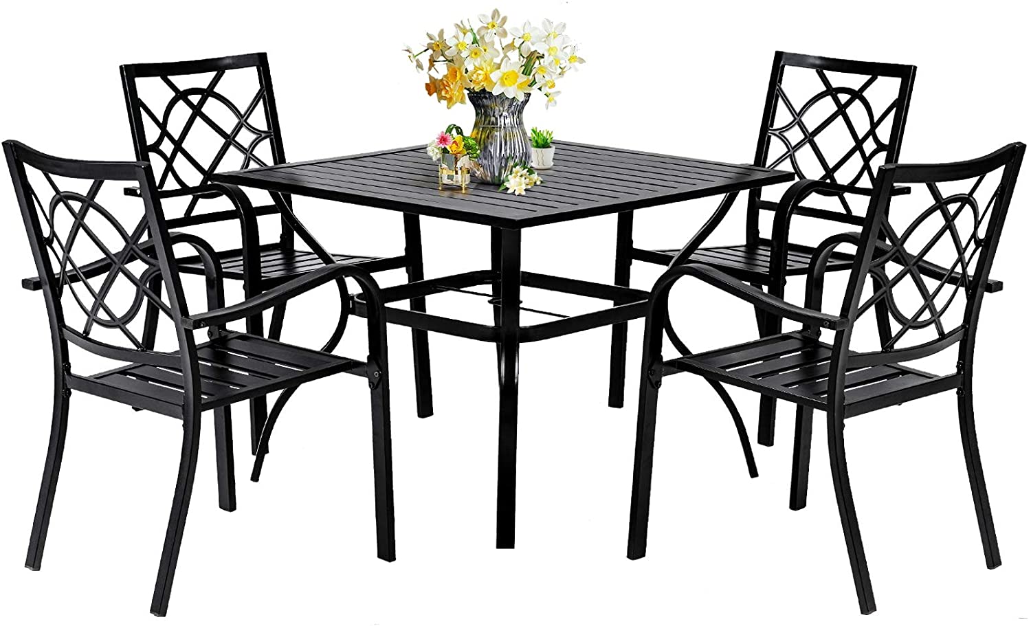 SUNCROWN 5-Piece Outdoor Patio Dining Set Stackable Metal Chairs and square Table Set With 1.57" Umbrella Hole, Black