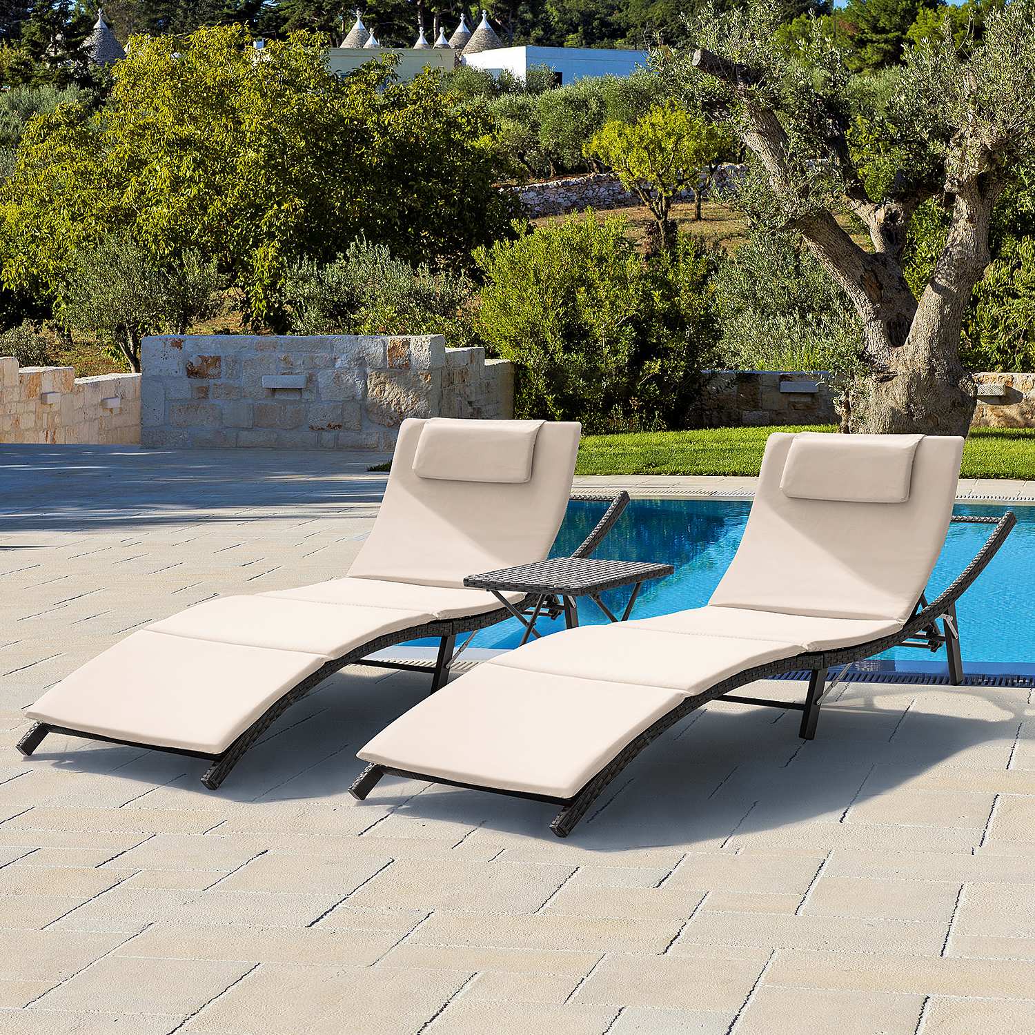 Devoko 3 Pieces Patio Outdoor Chaise Lounge Chair Clearance Outdoor Furniture Set PE Rattan Adjustable Folding Pool Lounge Chair , Beige