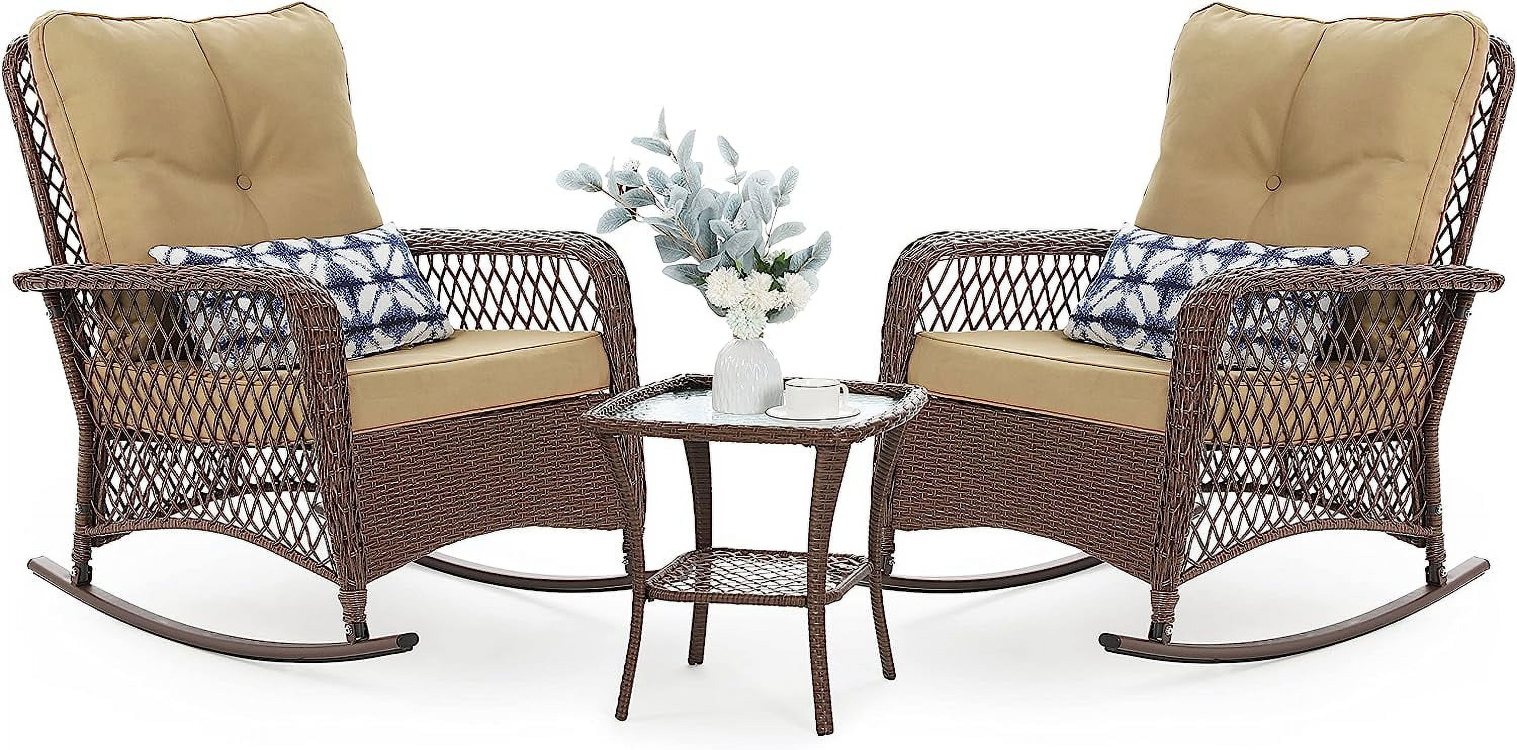 Techmilly 3-Piece Outdoor Rocking Chairs, Wicker Patio Furniture with Thickened Cushions and Table for Porch (Khaki)