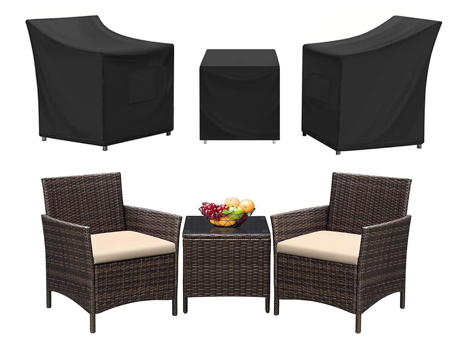 SIRUITON 3 Pieces Patio Set Cover Fit for Outdoor Wicker Patio Furniture Sets Modern Bistro Set Rattan Chair Conversation Sets with Durable and Water Resistant Fabric ,Black
