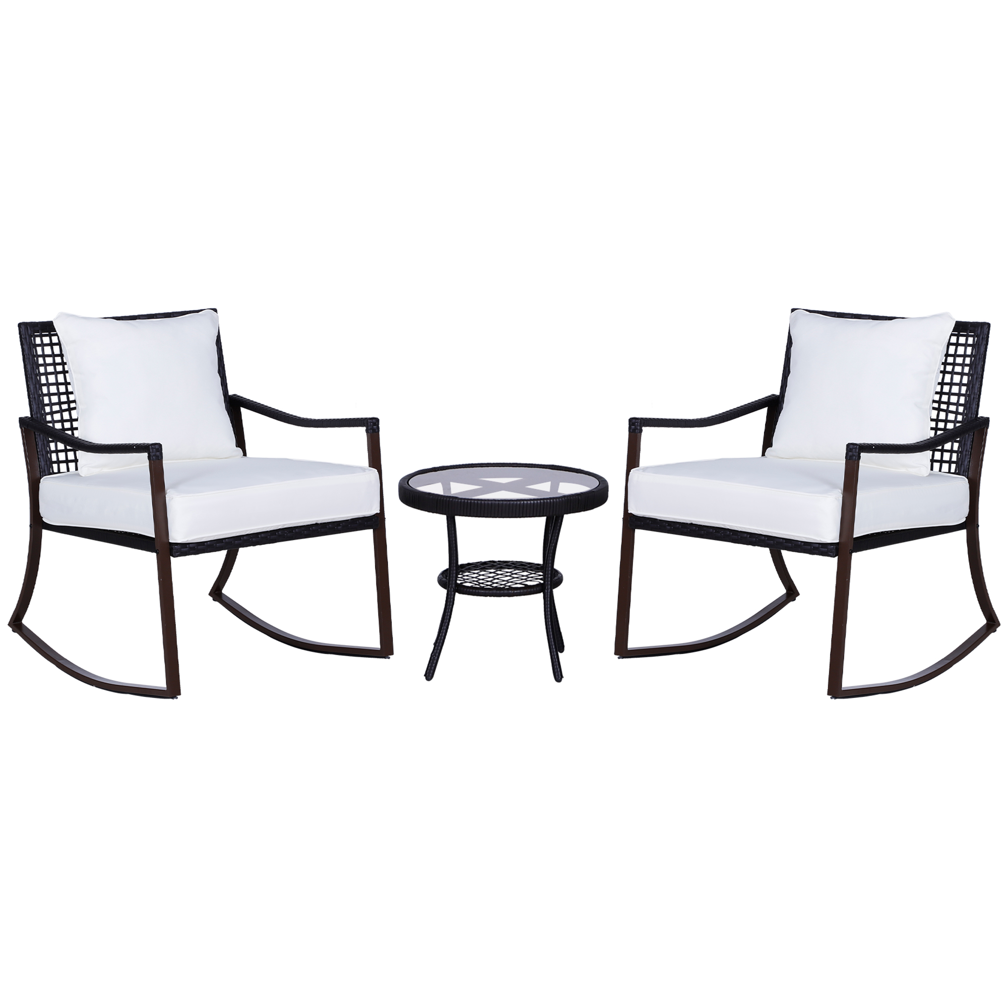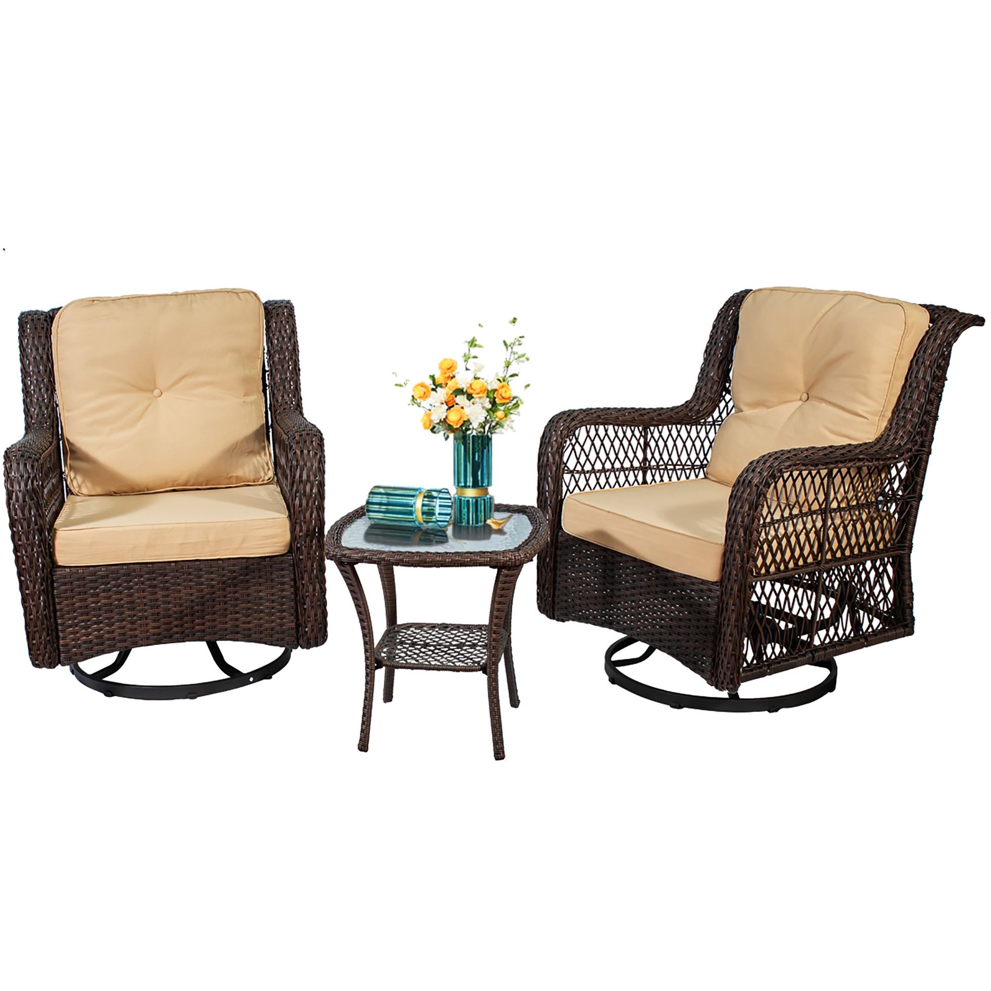 3PCS Patio Wicker Rattan Bistro Furniture Set, Swivel Rocking Cushioned Chair Table Set, Outdoor Rattan Conversation Sets