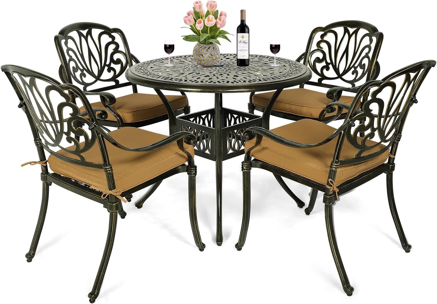 MEETWARM 5 Piece Outdoor Furniture Patio Dining Set, All-Weather Cast Aluminum Patio Table and Chairs Set- 4 Cushioned Chairs, 1 Round Dining Table with Umbrella Hole for Backyard Garden Deck