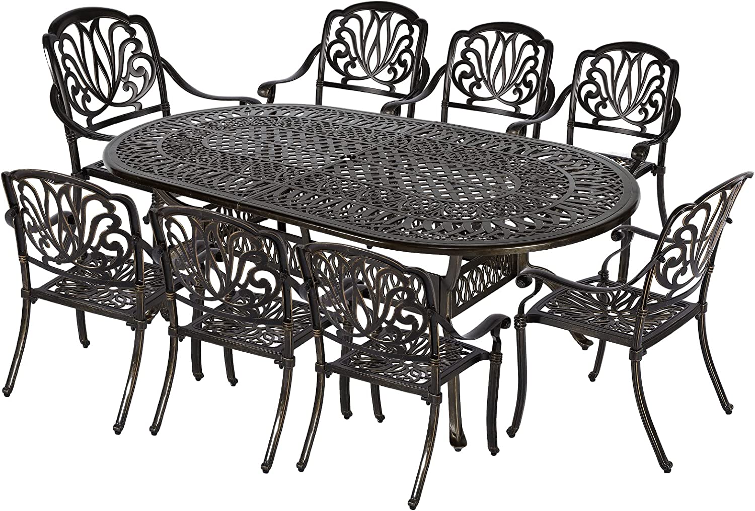VIVIJASON 9-Piece Patio Furniture Dining Set, All-Weather Cast Aluminum Outdoor Conversation Set, Include 8 Chairs and an Oval Table with Umbrella Hole for Balcony Lawn Garden Backyard