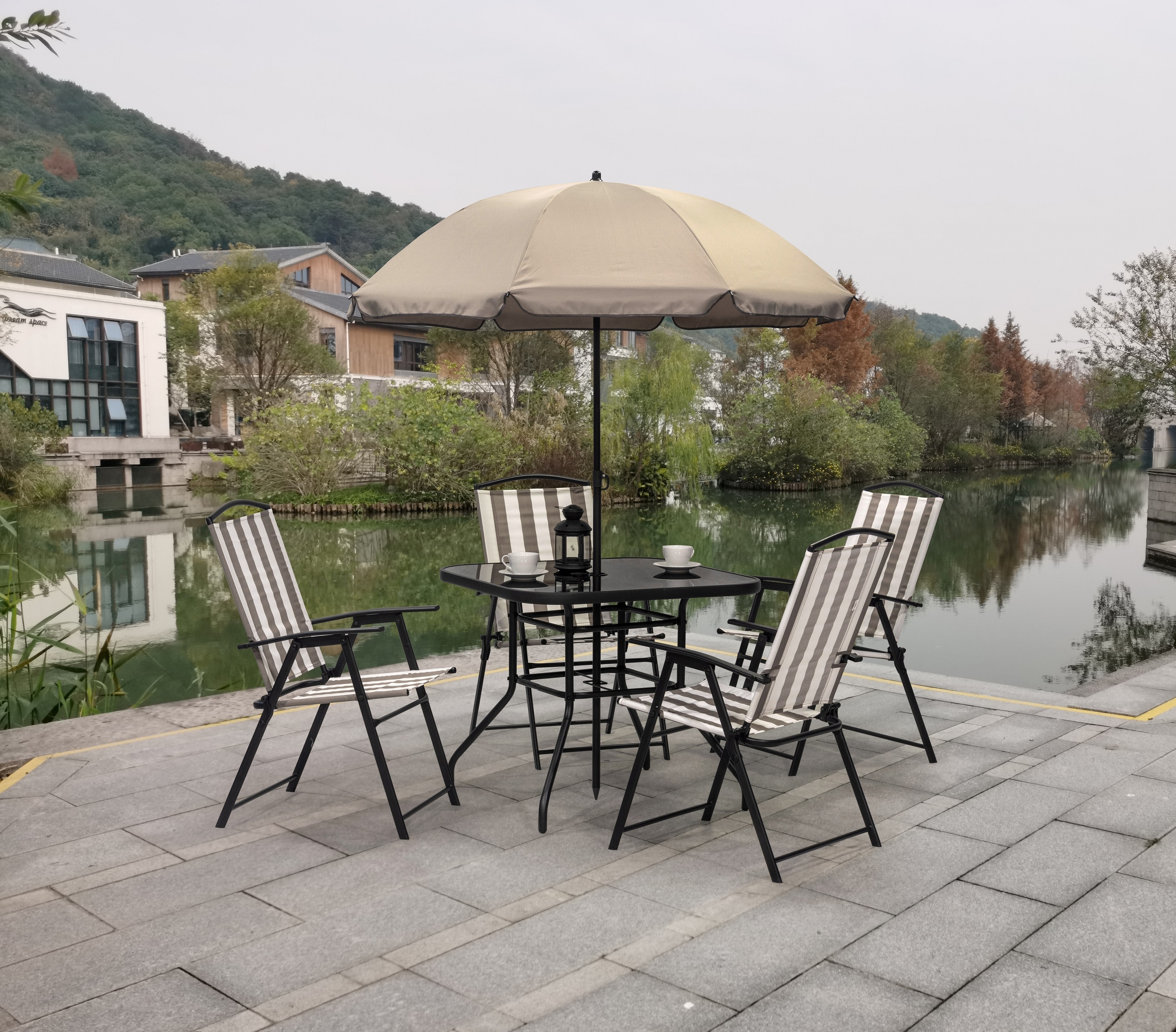 outdoor Patio funiture Santa Cruz 6 piece folding dining set with umbrella , table and 4pcs folding chairs, brown/white stripe