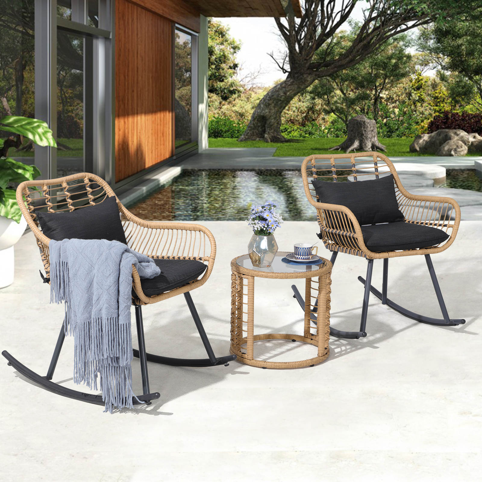 JOIVI Outdoor Bistro Set, Patio Furniture Wicker Rocking Conversation Set, 3 Piece All Weather Rattan Rocker Chairs Set with Tempered Glass Top Side Table and Cushions