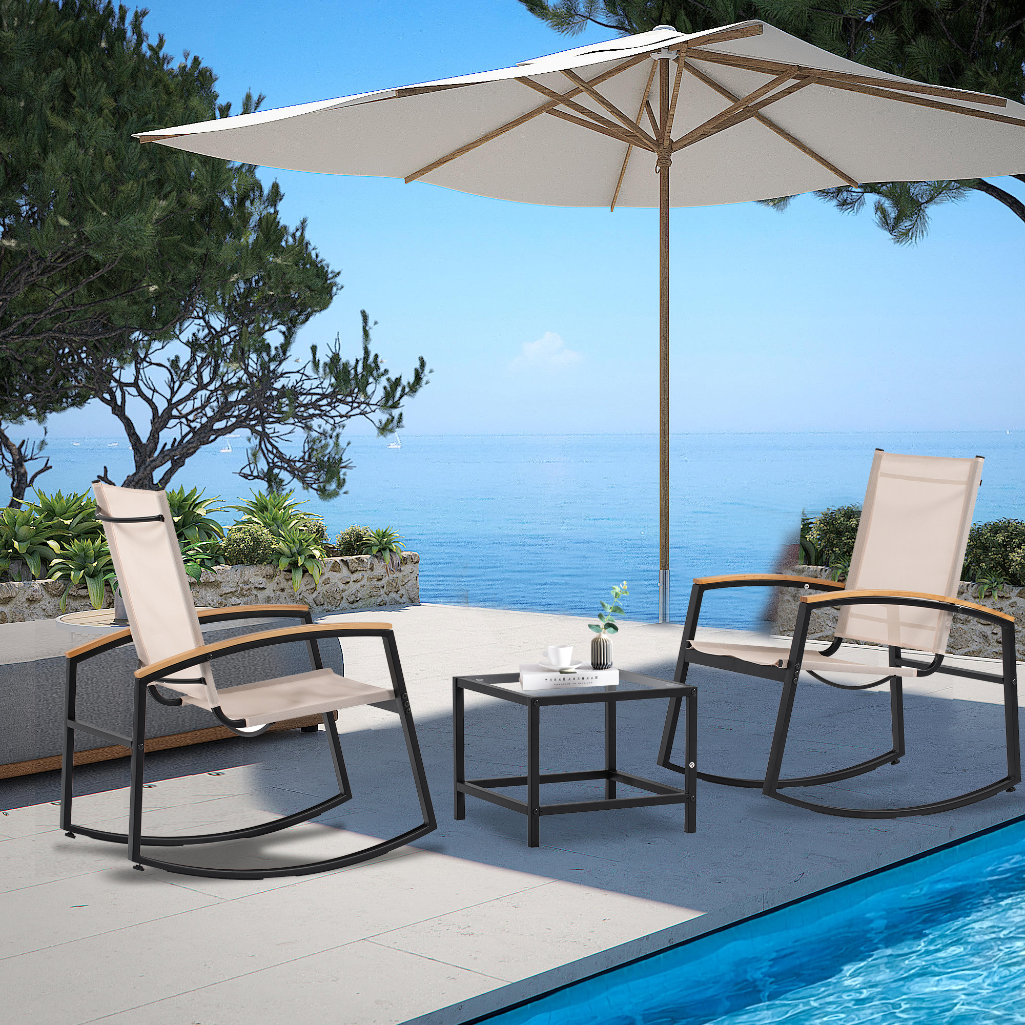 3 Piece Outdoor Patio Furniture Set, Rocking Bistro Set, Textilene Fabric Patio Furniture Set, Front Porch Rocker Chairs Conversation Set with Glass Coffee Table for Lawn, Garden, Balcony, Poolsid