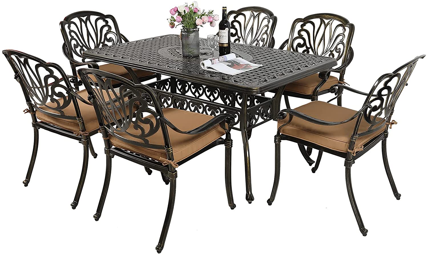 MEETWARM 7-Piece Outdoor Furniture Dining Set, All Weather Cast Aluminum Patio Garden Set with 6 Cushioned Chairs, 1 Rectangular Table, 2" Umbrella Hole, Dark Bronze
