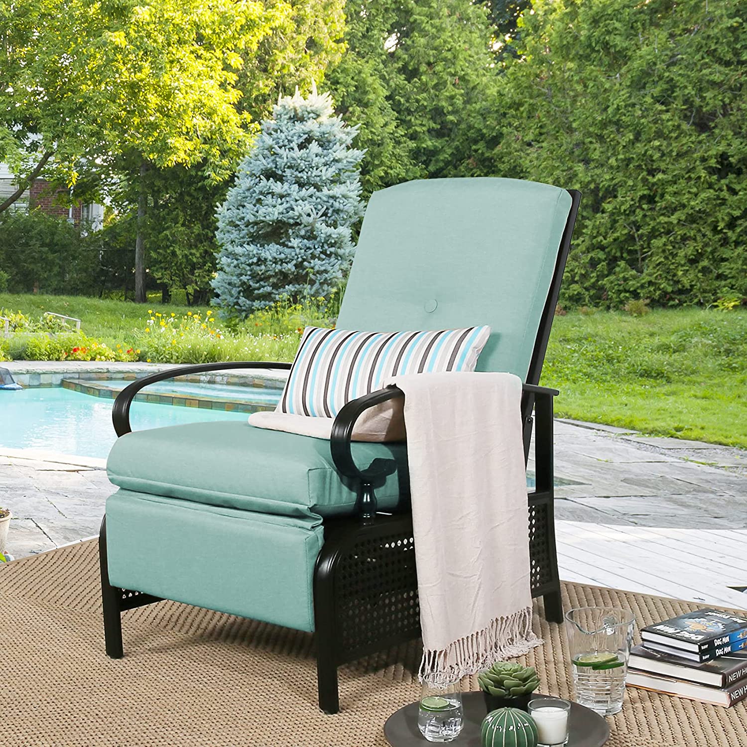 Ulax Furniture Patio Metal Recliner Lounge Chair with Olefin Cushion, Mist Blue