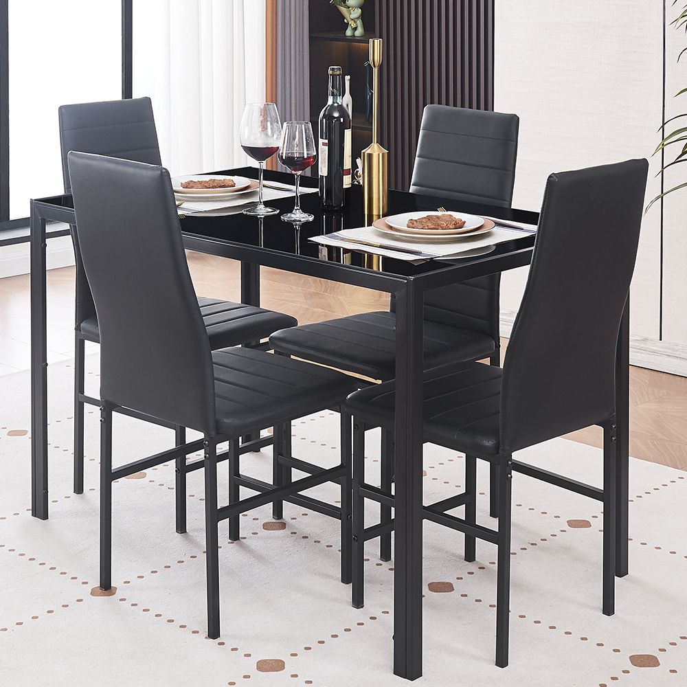Dining Table Set for 4, 5 Piece Kitchen Table and Chairs with Black Tempered Glass Table Top and 4 Black Faux Leather Metal Frame Chairs,47.2" x 27.5" x 29.5"