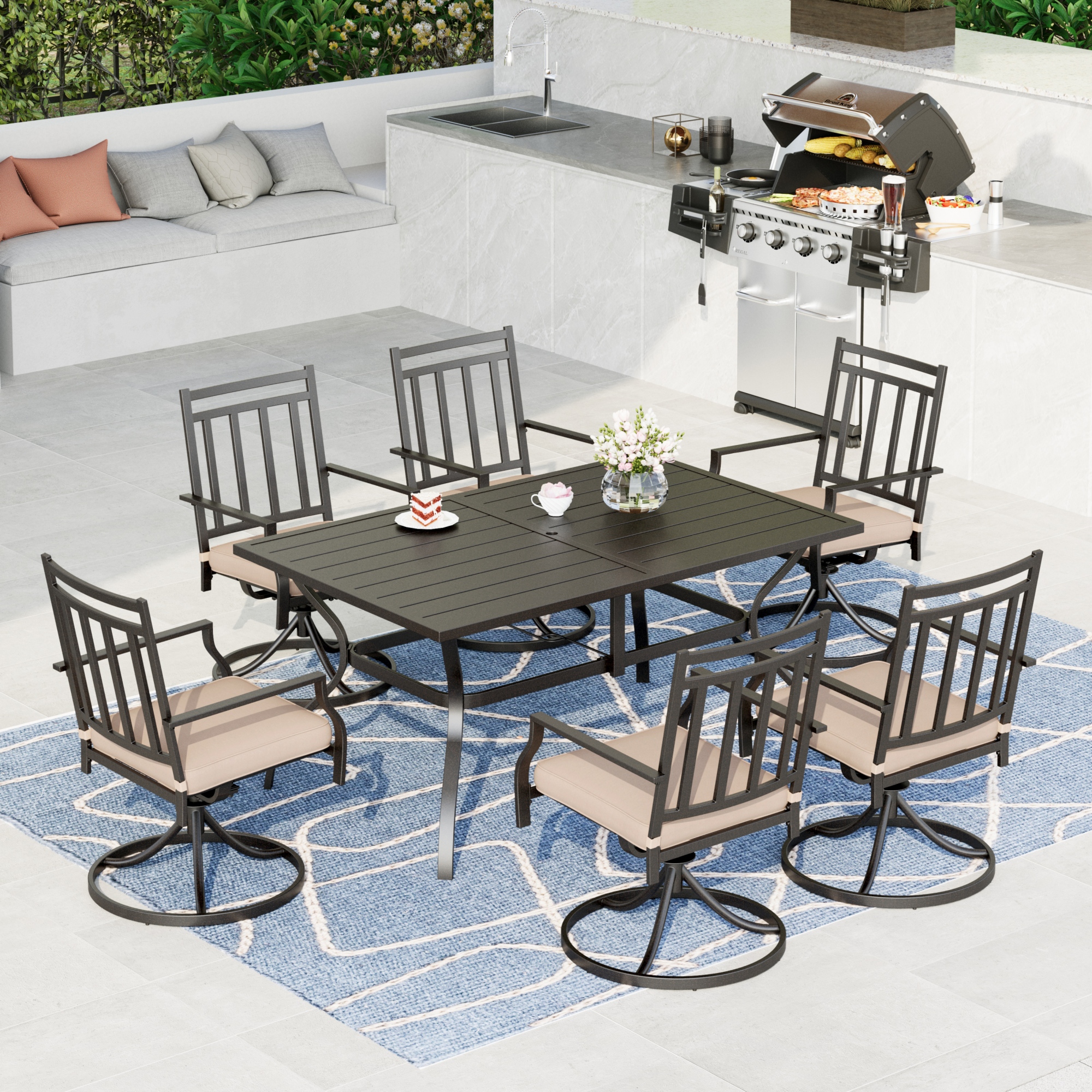 MF Studio 7-Piece Outdoor Dining Set with Swivel Cushioned Chairs & Rectangle Table for 6-Person, Black & Beige