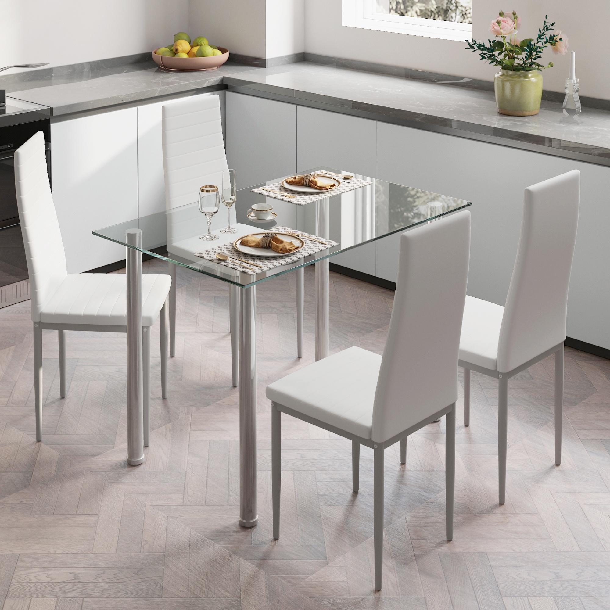 5 Piece Dining Table Set, BTMWAY Glass Tabletop and PU Leather Upholstered Chairs for 4, Rectangular Dinette Sets for Breakfast Nook Living Room, Modern Dining Room Table Set, White