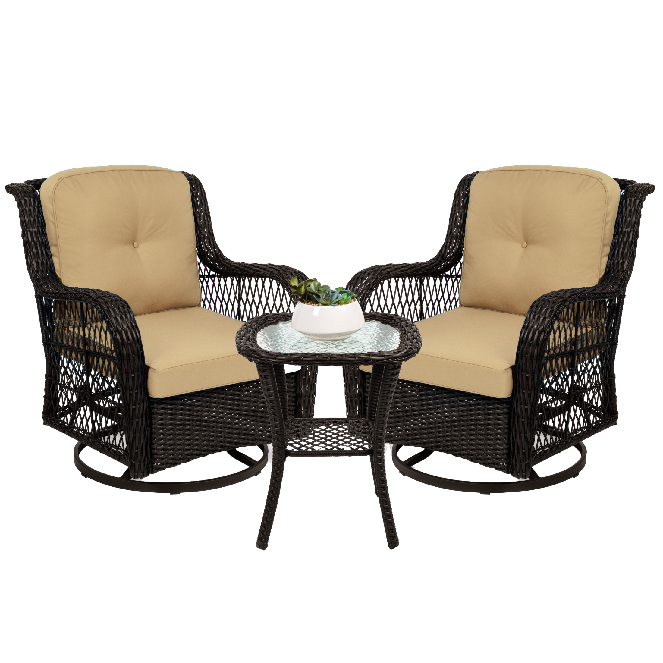 Best Choice Products 3-Piece Patio Wicker Bistro Furniture Set w/ 2 Cushioned Swivel Rocking Chairs, Side Table - Beige