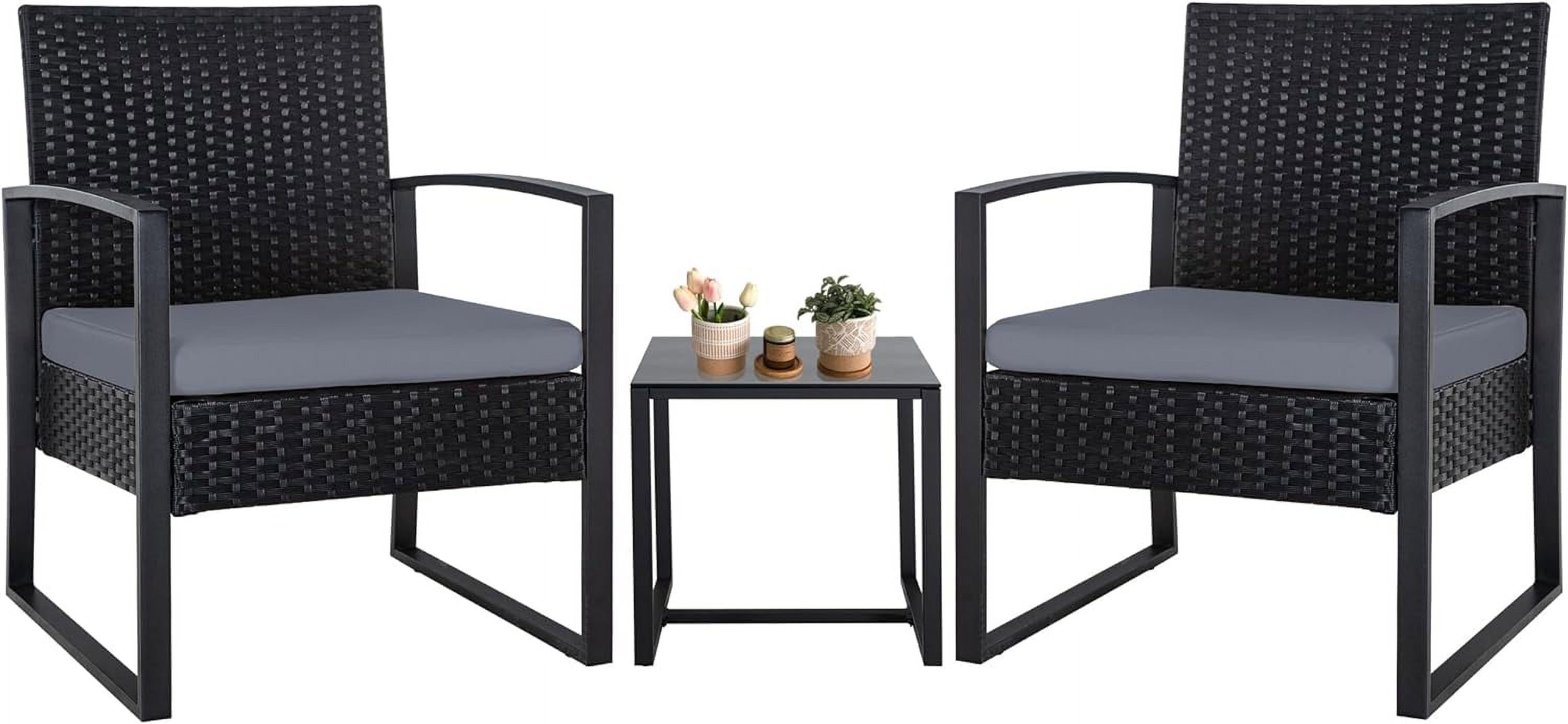 FHFO 3 Pieces Patio Furniture Set, Outdoor Wicker Conversation Bistro Set w/ 2 Chairs, 2 Cushions, Glass Coffee Table for Garden Balcony Backyard Porch Lawn - Black Wicker & Grey Cushions
