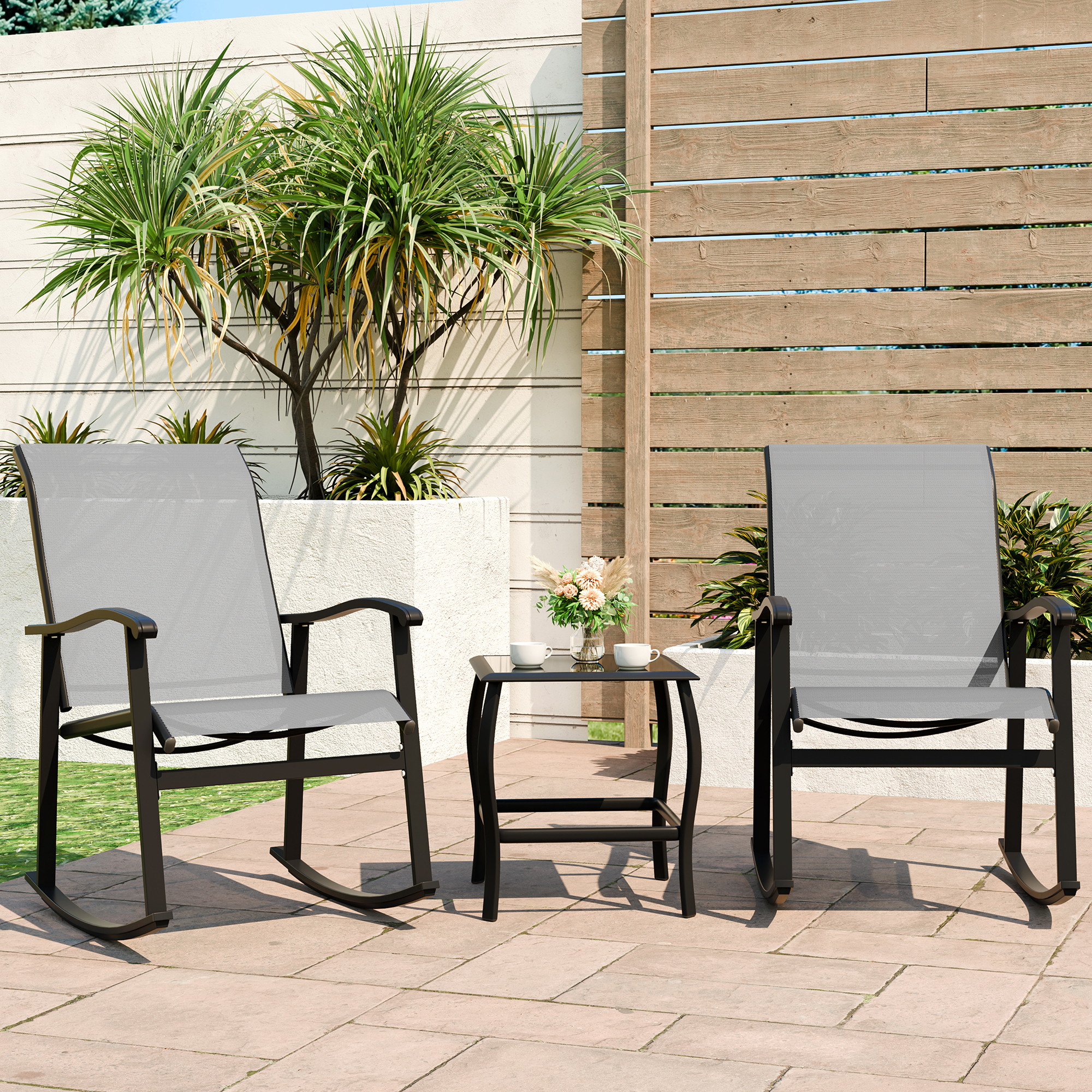 Walsunny 3 Piece Rocking Bistro Set, Outdoor Furniture with Rocker Chairs and Glass Coffee Table Set of 3 Light Gray
