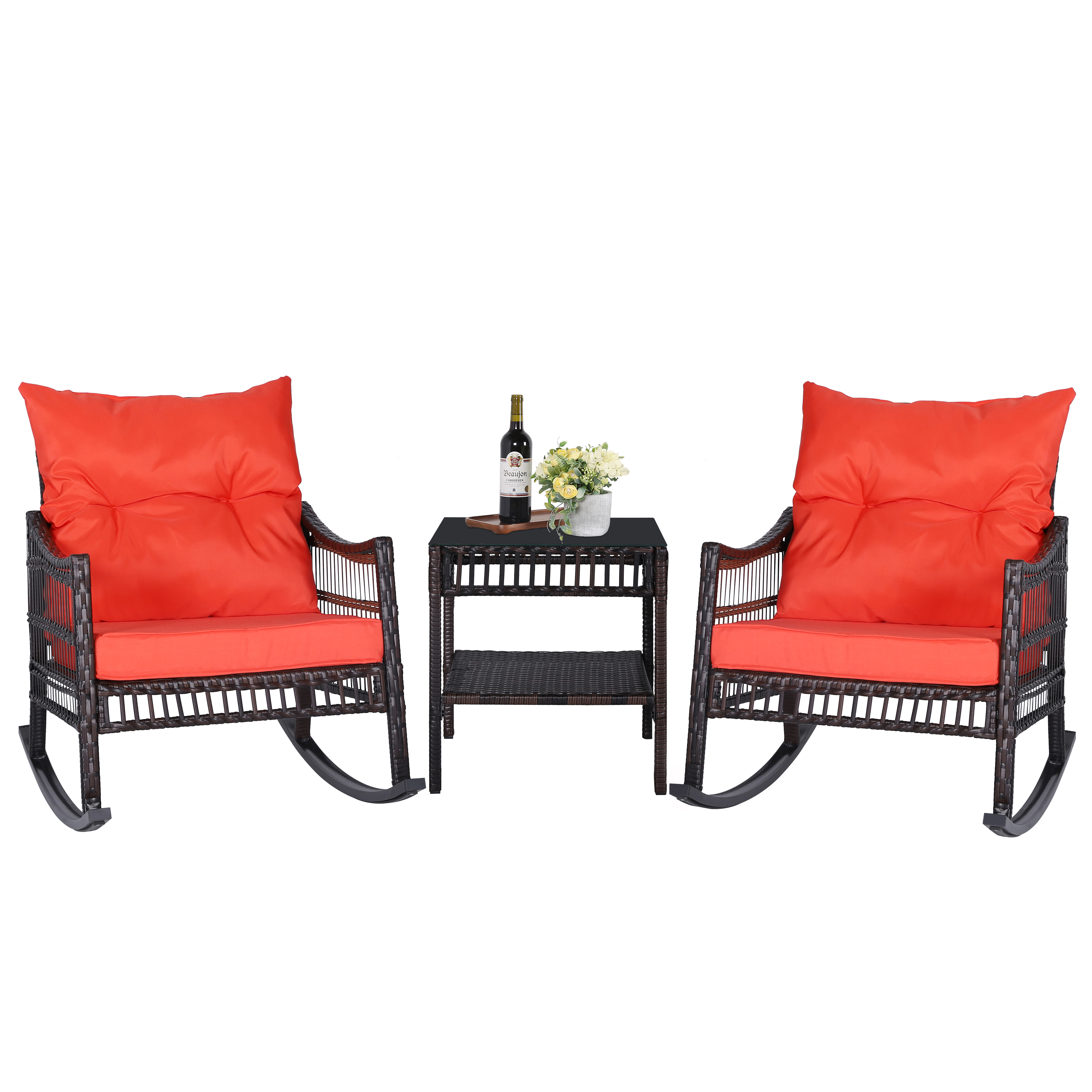 VEIKOUS 3-Piece Outdoor Rocking Chair Wicker Bistro Set w/ Table & Cushions, Orange