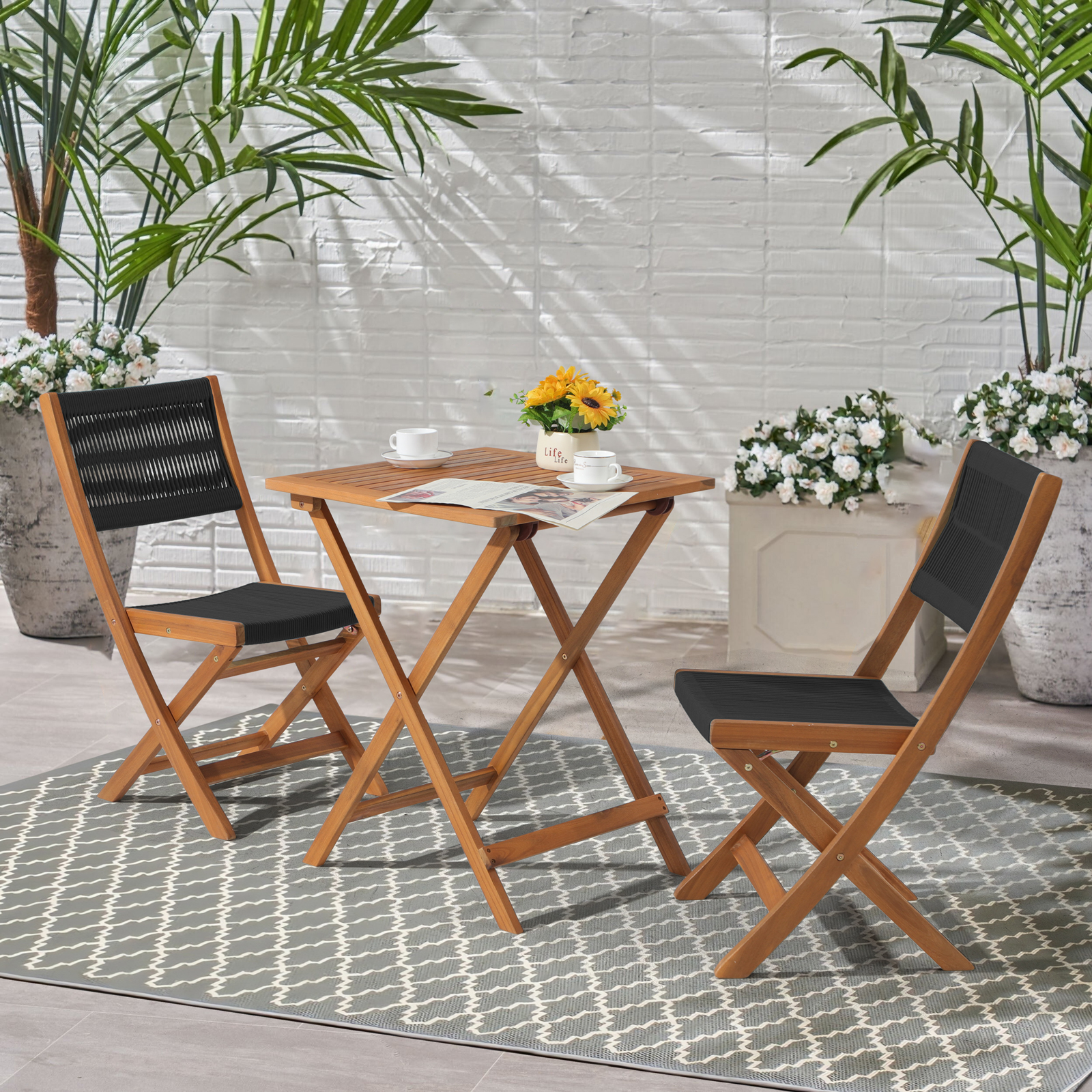 OC Orange-Casual Acacia Patio Bistro Set, Outdoor Compact Wood Square Table and Chairs, 3 Piece, Black