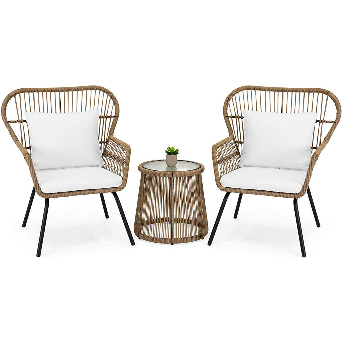 3-Piece Patio Wicker Conversation Bistro Set w/ 2-Chairs, Glass Top Side Table, Cushions