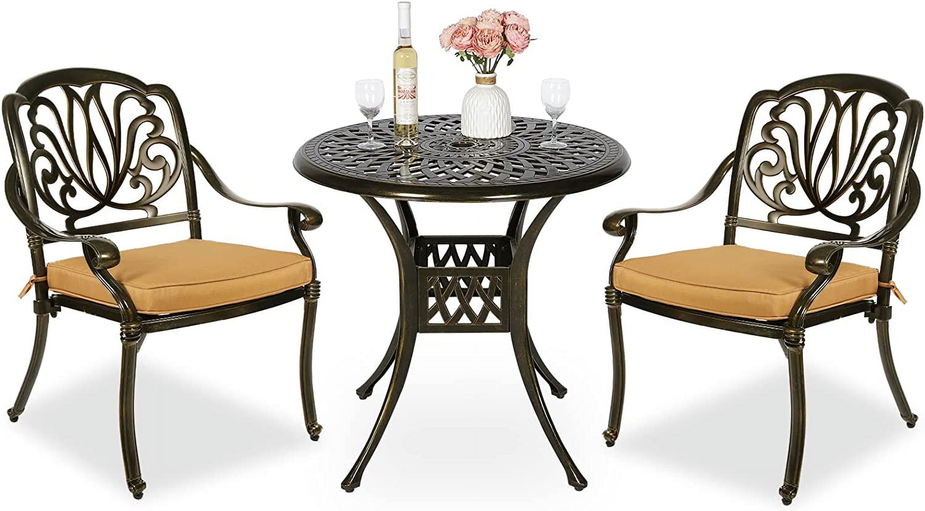 MEETWARM 3 Piece Patio Bistro Set, Outdoor All-Weather Cast Aluminum Dining Furniture Set Includes 2 Cushioned Chairs and a 31” Round Table with Umbrella Hole for Garden Deck