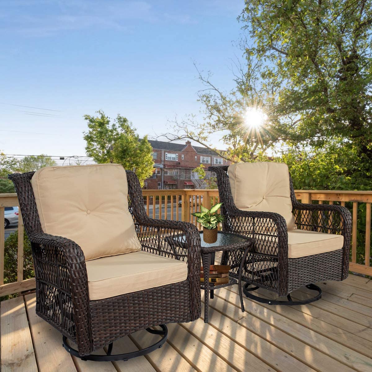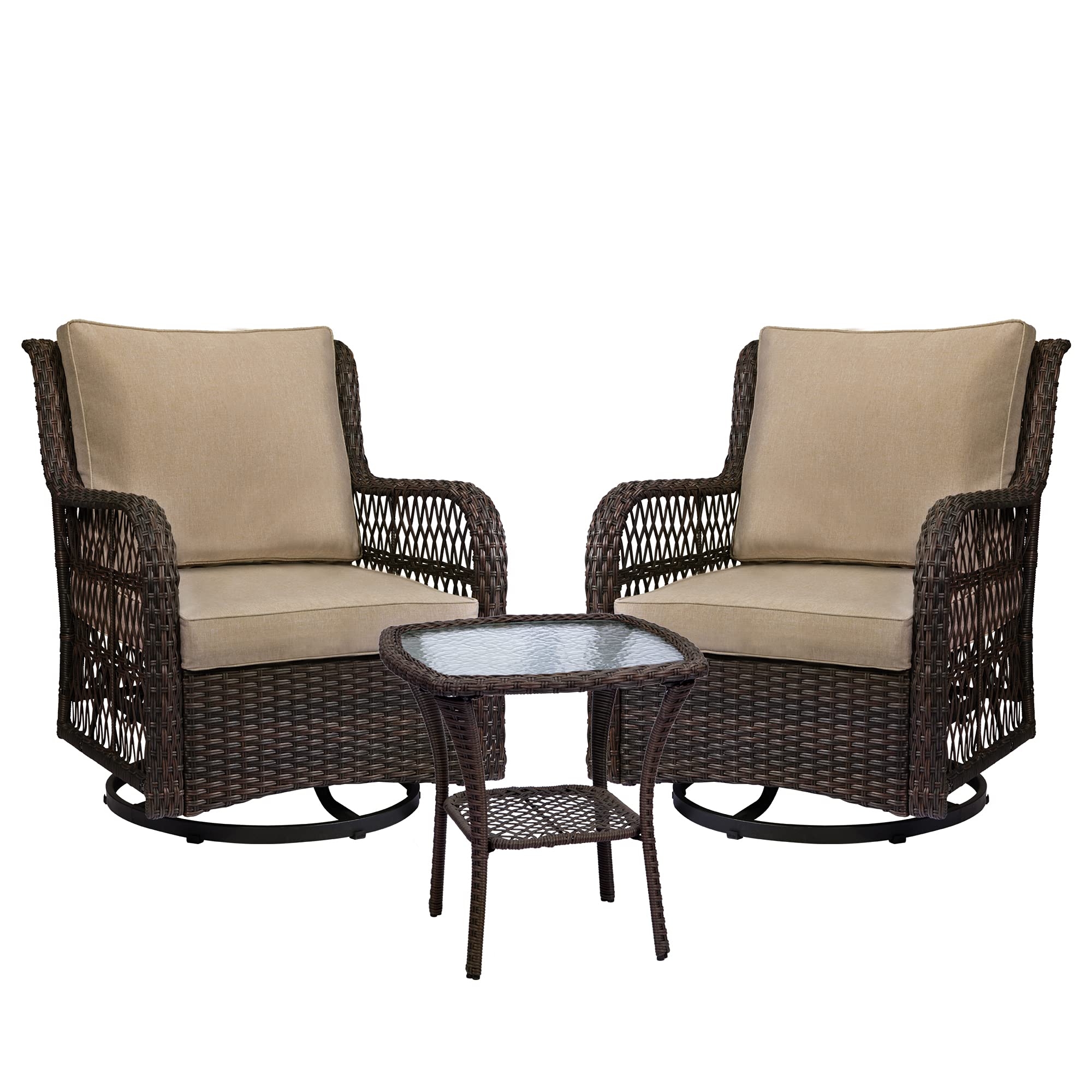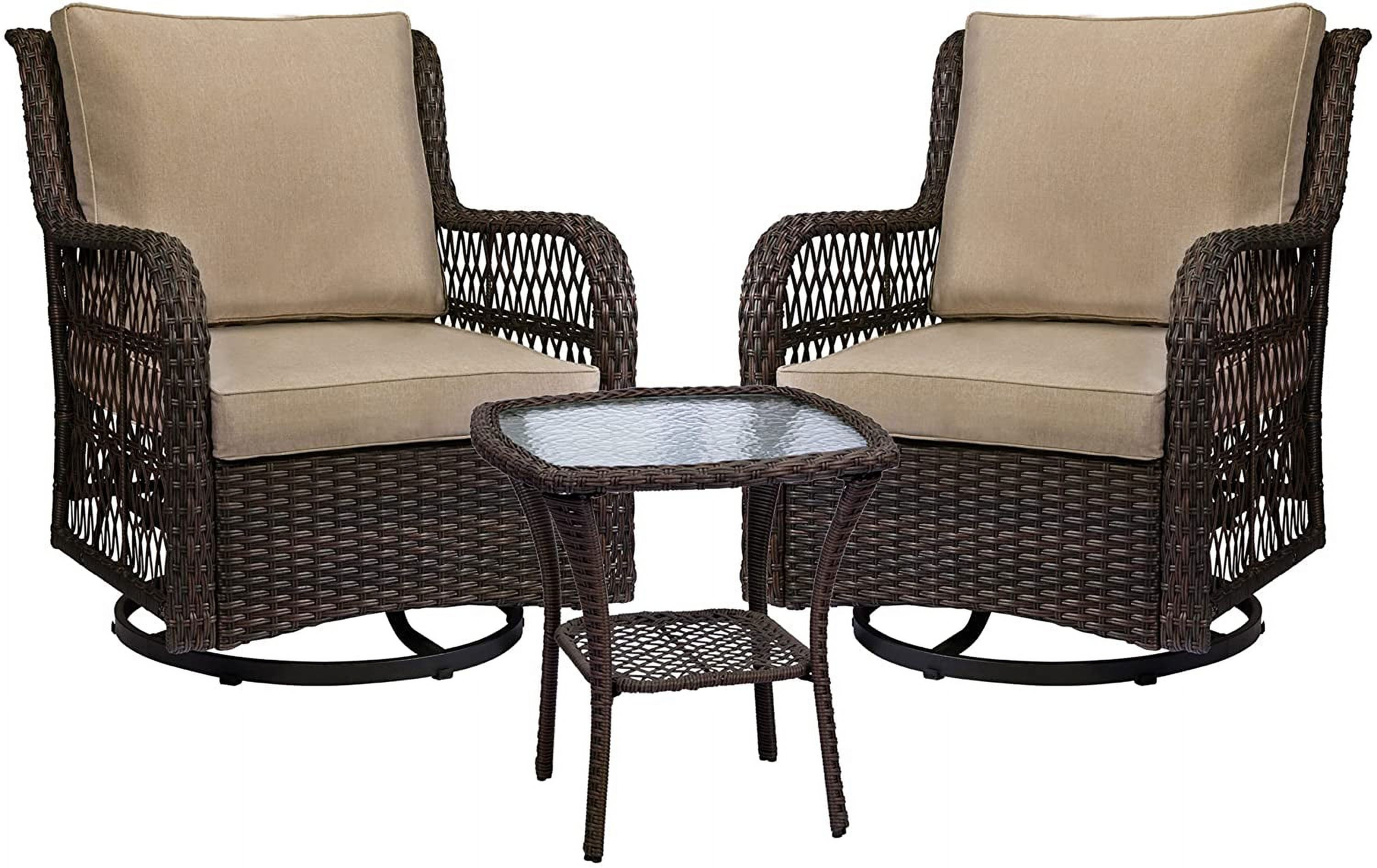Odaof Outdoor Wicker Patio Bistro Set with 360-Degree Swivel Rocking Chairs of 2 and Matching Side Table with Super Soft Cushions(Beige)
