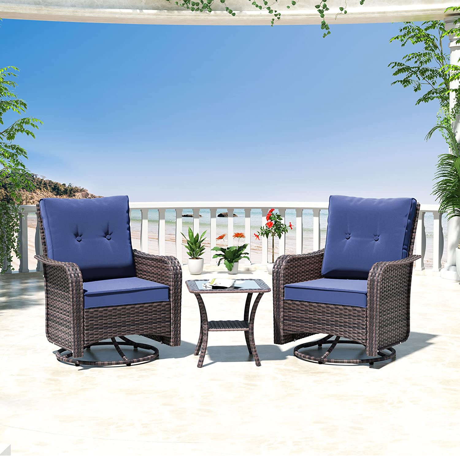 Kullavik 3PCS Wicker Rocking Chair Swivel Chairs, Patio Furniture Set Rattan Rocking Bistro Sets with Coffee Table for Outdoor Porch Deck Garden Backyard,Navy Blue