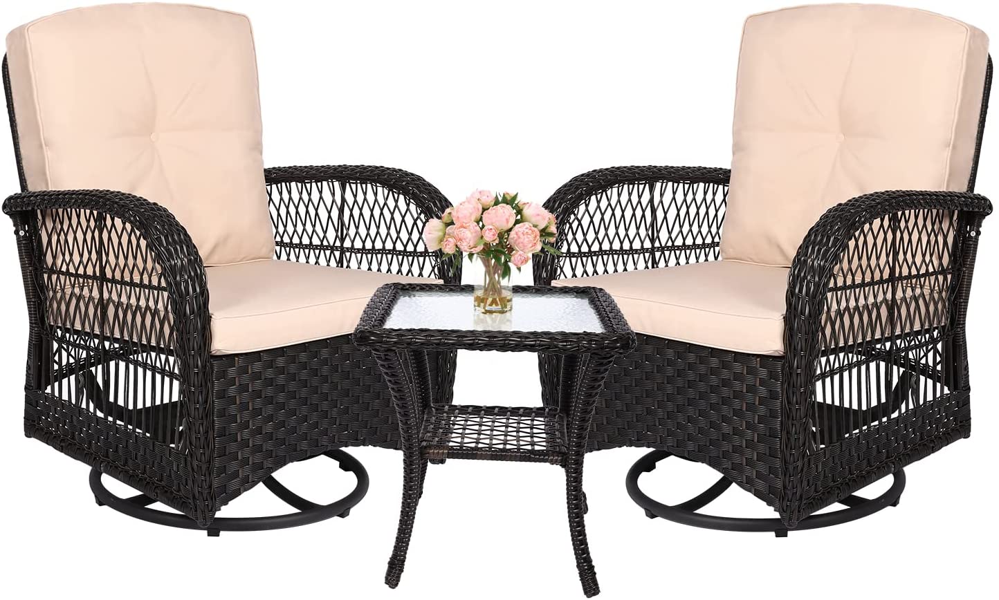 Leeten Rattan Swivel Chair Set of 2, 3-Pieces Outdoor Wicker Patio Bistro Set, Wicker Rocker Chair with Table and Cushion, Leisure Chair for Patio Garden