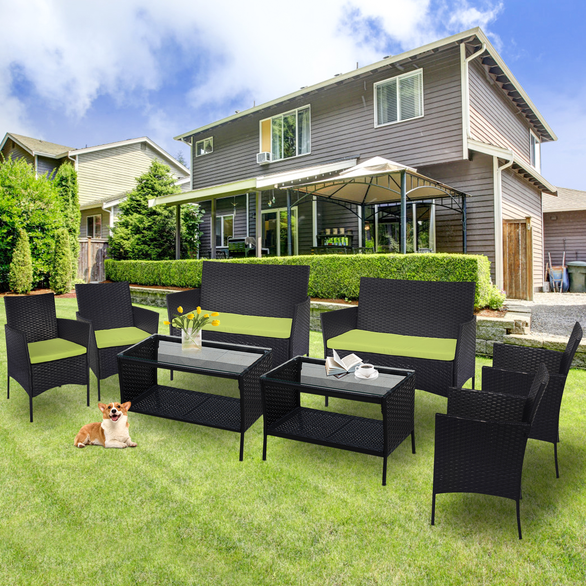 8 PCS Outdoor Patio Bistro Furniture Set, All-Weather Rattan Chair Set, Conversation Furniture Sets, Cushioned Seat & Glass Table, Bistro Table Set for Porch Garden Poolside Balcony, T203