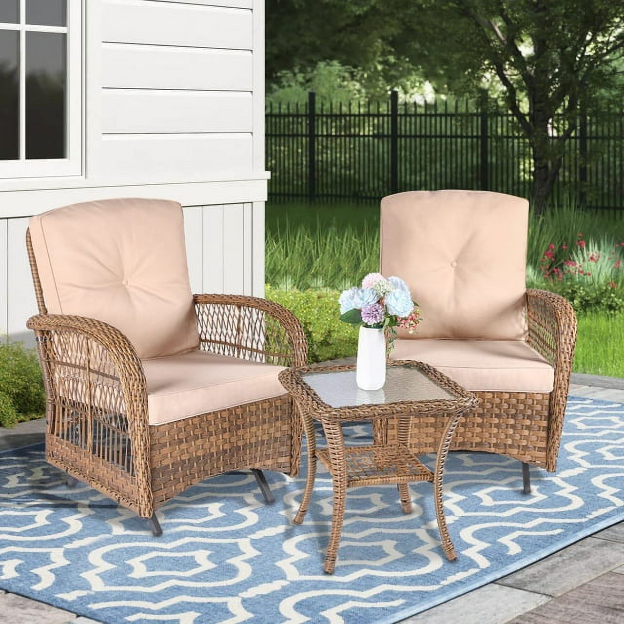 MEETWARM 3 Pieces Outdoor Patio Wicker Rocking Glider Set, Rocking Chairs Rattan Patio Furniture Sets with Thickened Cushion and Glass-Top Coffee Table, Conversation Bistro Set for Porch & Backyard