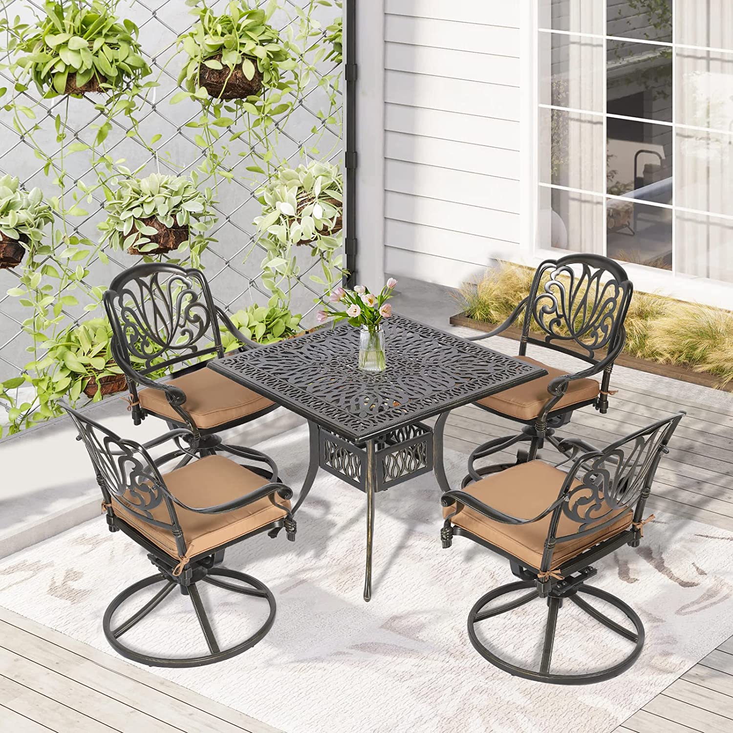 W WARMHOL 5 Piece Patio Dining Set, Outdoor Table and Chairs Set for 4 Cushioned Swivel Rocking Chairs and 35.2" Square Table, All-Weather Cast Aluminum Patio Funiture Set, 2.2" Umbrella Hole
