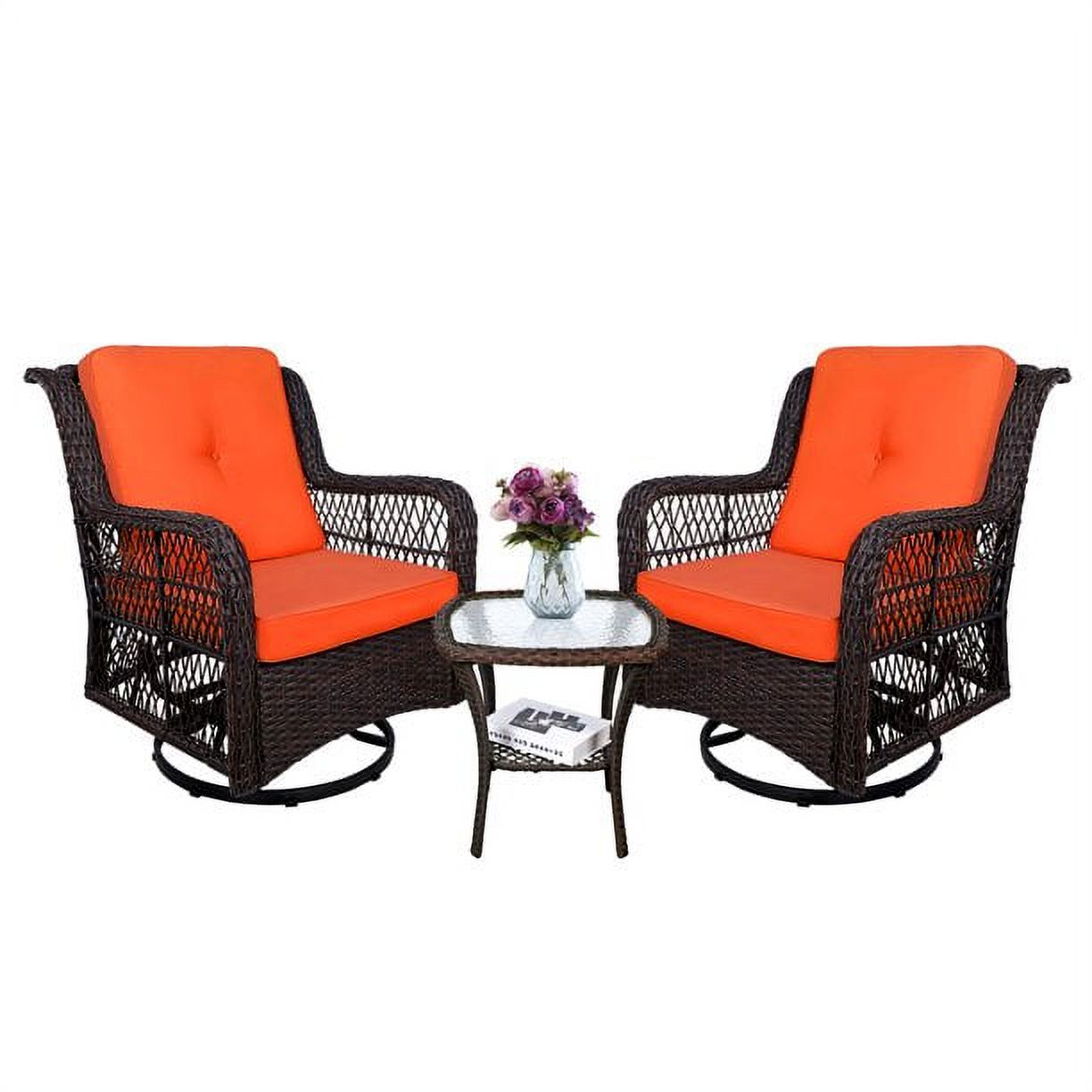 MEETWARM 3-Piece Patio Wicker Conversation Bistro Set Cushioned, Outdoor Swivel Rocking Chairs Rattan Furniture Sets with Thickened Cushion and Glass-Top Coffee Table (Orange)