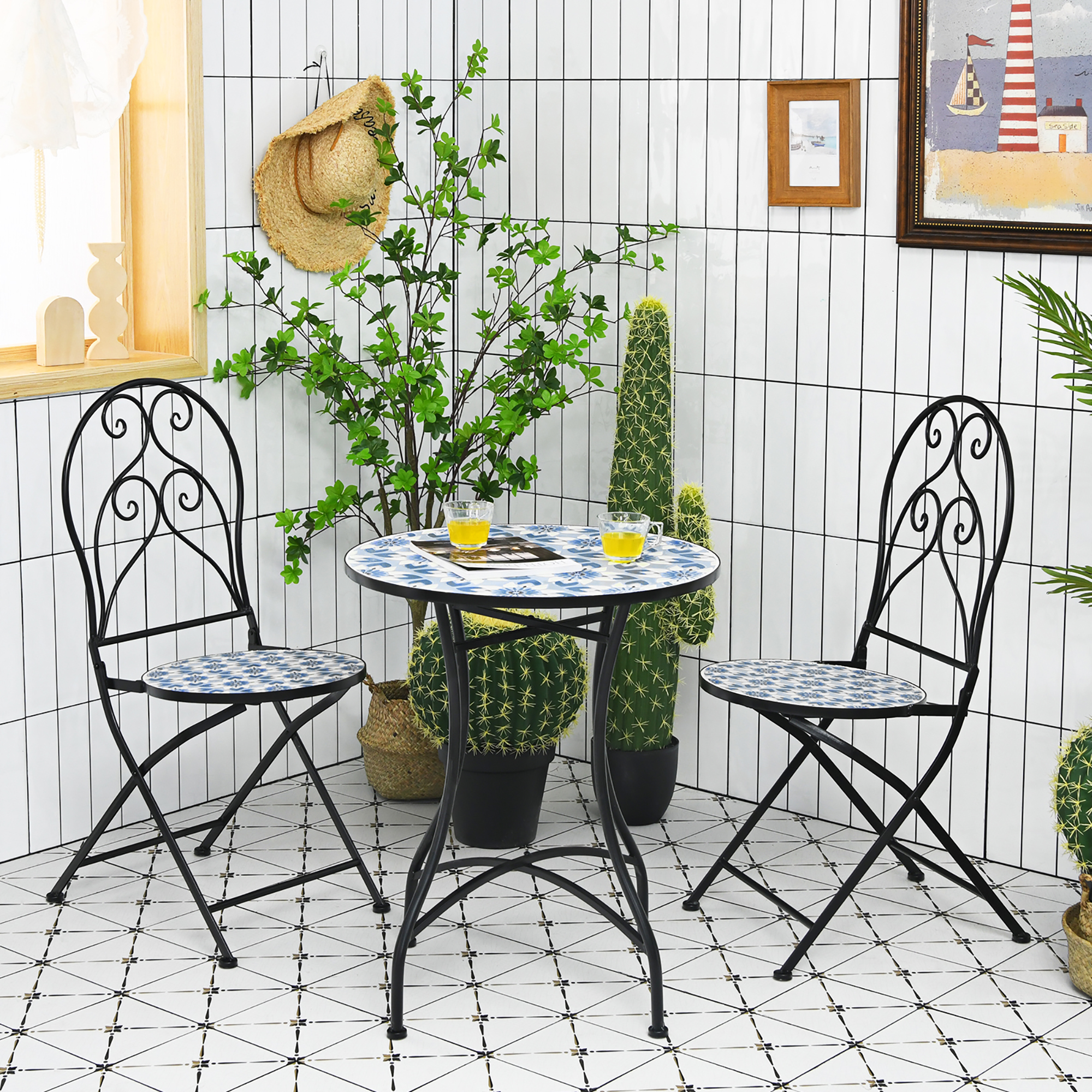 Costway 3PCS Patio Bistro Furniture Set Folding Chair Mosaic Design Garden Blue