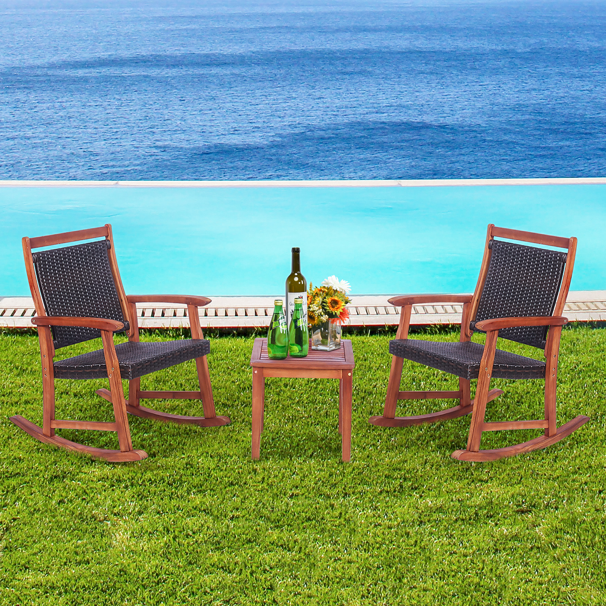 Costway 3PCS Patio Rattan Rocking Chair Bistro Set Acacia Wood Frame Armrest